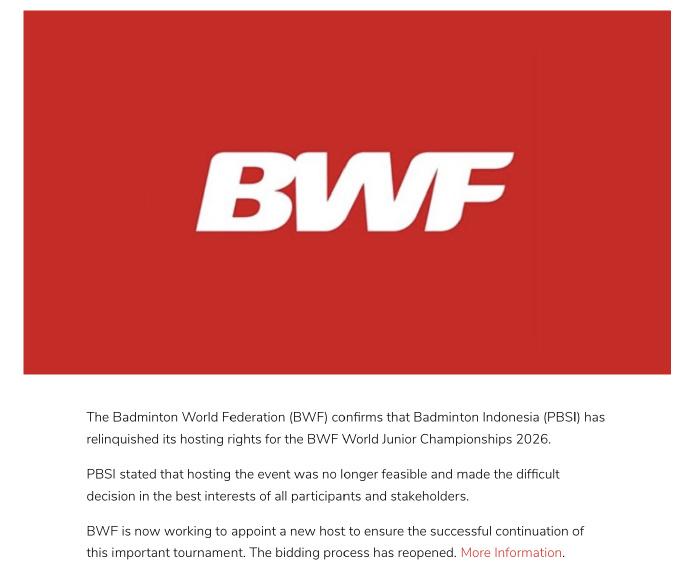 印尼羽协放弃2026年世青赛的举办权 世界羽联证实,印尼羽协已放弃2026年世界青年羽毛球锦标赛的举办权。印尼羽协表示,举办该项赛事已不再可行,为了所有参赛者及利益相关者的最佳利益,他们做出了这一艰难的决定。世界羽联目前正致力于任命新的承办方,以确保这一重要赛事的顺利举行。目前,申办程序已重新开启。 中国羽协要挺住,别啥事都往身上揽,没必要。