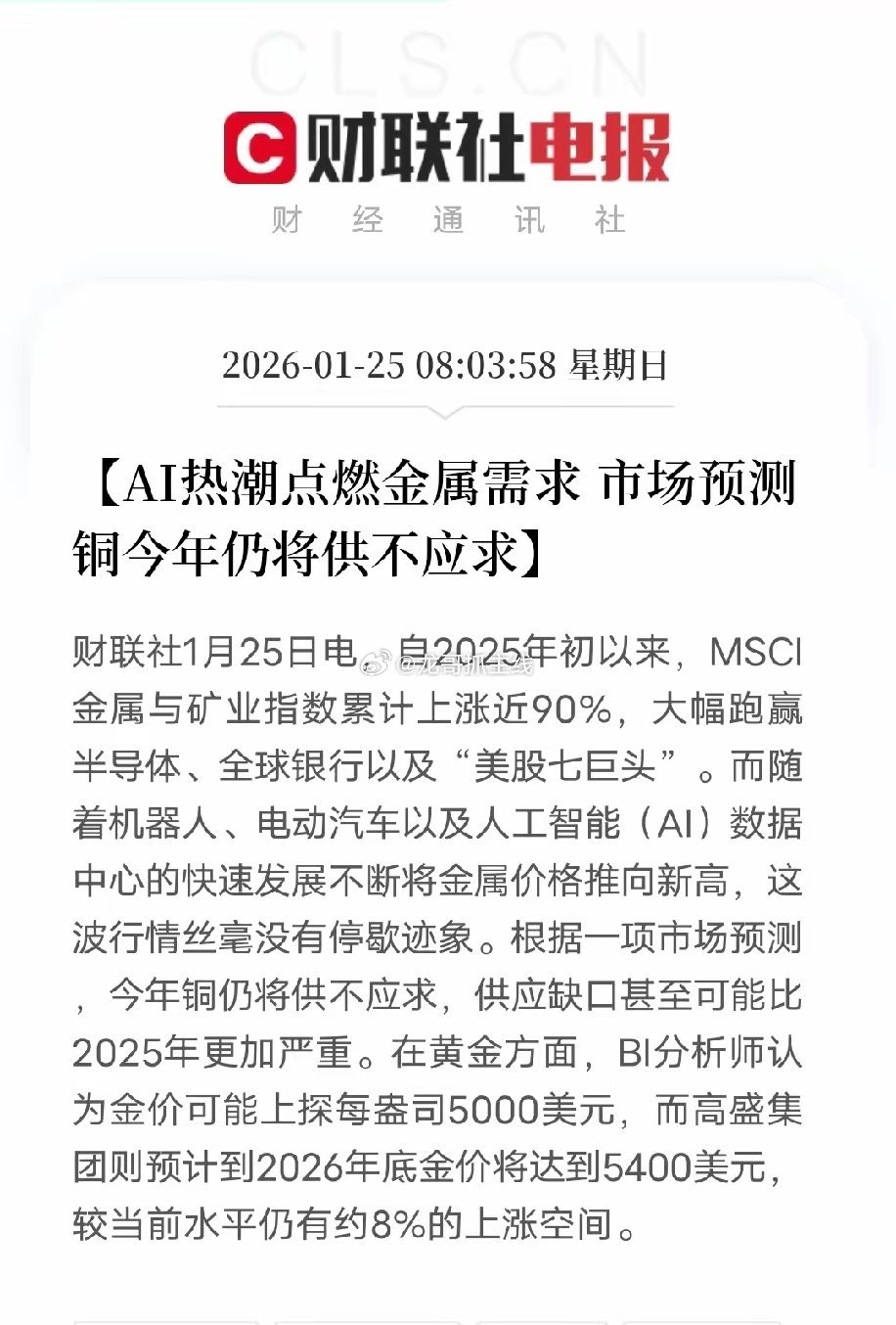 AI热潮彻底带火了金属行情,这波涨势远比想象中猛!2025年初至今MSCI金属与矿业指数涨了近90%,直接跑赢半导体和美股七巨头,核心原因就是AI、机器人、新能源汽车对金属的需求在疯狂拉升。被称作AI时代“原油”的铜成了绝对主角,不只是数据中心、算力设备离不开它,液冷散热、电力传输这些AI基建核心环节都得靠铜撑着,今年铜的供应缺口还会比去年更严重,毕竟矿端资本开支不足,新产能根本跟不上需求增速。贵金属这边也不示弱,BI看高金价至5000美元/盎司,高盛更是预测2026年底到5400美元,还有8%上涨空间。不管是工业金属还是贵金属,都踩着AI和能源转型的风口,这波行情的核心逻辑其实是供需的结构性错配,短期根本难逆转。