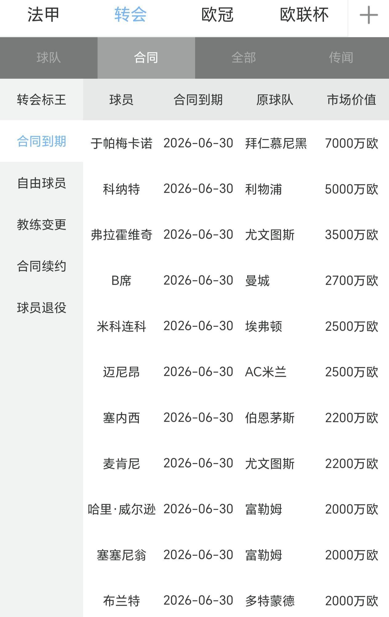 今年夏天合同到期的大牌球星。 拜仁于帕,高薪不续约就走人。 利物浦科纳特,皇马觉得利物浦丢球多,已经开始放弃科纳特,他还走不走? 尤文图斯弗拉霍维奇,哪个豪门要? 目前还是于帕7000万身价最高,拜仁要想清楚,别亏本呀。[可怜]