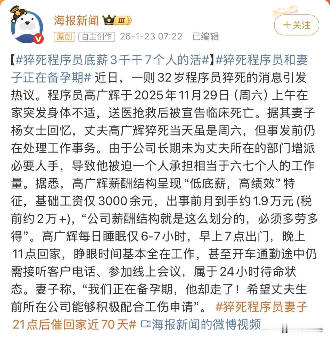 这妥妥的是把人当做牛马了! 32岁的程序员高广辉的公司长期干不给他的部门增派人手,导致他被迫的承担六七个人的工作量。高广辉早上7点出发上班,晚上11点回家,即使在开车在路上,也会接听客户电话、参加线上会议,每日睡眠只有六七个小时,挣眼的时间基本都是在工作! 高广辉身体突发身体不适,随即被送到了医院,但是很遗憾没有抢救过来,在就医前仍在工作,即使在医院抢救期间,各种工作群也是信息不断! 这种高压的工作谁能受得了啊,能整整这工作风气吗,真心希望企业能重视员工健康,工作时间不是衡量效率的唯一标准! 996加班无底线的工作,在保护劳动者的身体健康和权益与资本家追求高利润高效率面前,往往都是选择了后者。隐形加班,所谓自愿加班现象太严重了!