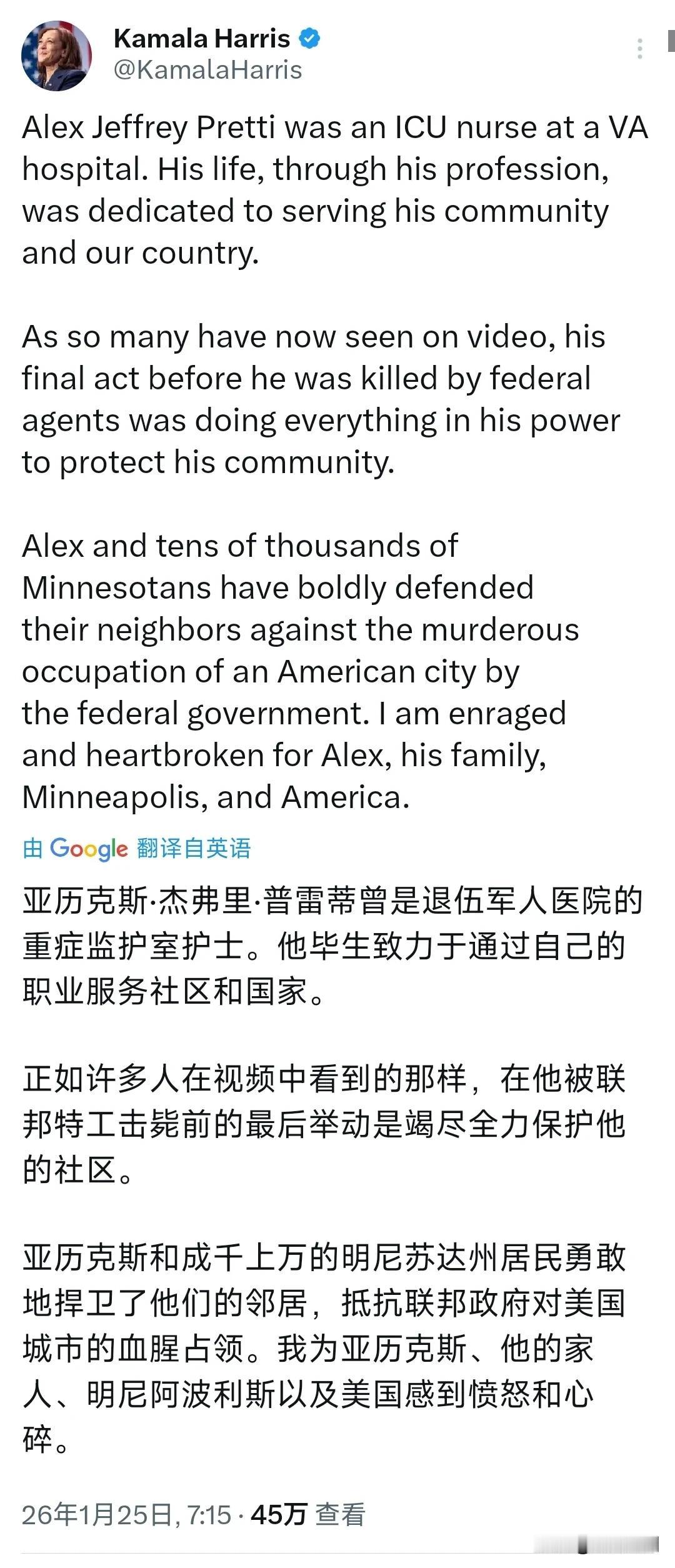 美国前副总统卡玛拉·哈里斯今天(北京时间1月25日)发文写道:“亚历克斯·杰弗里·普雷蒂曾是退伍军人医院的重症监护室护士。他毕生致力于通过自己的职业服务社区和国家。正如许多人在视频中看到的那样,在他被联邦特工击毙前的最后举动是竭尽全力保护他的社区。亚历克斯和成千上万的明尼苏达州居民勇敢地捍卫了他们的邻居,抵抗联邦政府对美国城市的血腥占领。我为亚历克斯,他的家人,明尼阿波利斯以及美国感到愤怒和心碎。” 评几句: 护工拍真相遭射杀!美国执法暴力撕开人权假面具 明尼苏达街头再酿悲剧,37岁急诊护士亚历克斯为守护社区,记录现场时身中数枪倒下。他手中没有武器,只有一部想要还原真相的手机。 现场视频铁证如山,美方官方却抛出“自卫”说法,这番表述遭当地州长严厉驳斥,更引发民众对执法公正的强烈质疑。美方高层非但不追查真相、回应民意,反而将事件引向政治对立,用指责代替调查,用推诿掩盖问题。 亚历克斯的遭遇从不是个例,而是美国执法暴力泛滥的又一血证。从弗洛伊德到白衣天使,执法者“保护与服务”的誓言,屡屡在冰冷枪声中沦为空谈。更心寒的是,无辜生命常成美国两党博弈筹码,双方互相指责,唯独将真相与正义抛在脑后。 哈里斯的愤怒与心碎,道出了美国民众的共同心声。执法力量沦为暴力工具、政治操弄凌驾生命之上、真相在权力博弈中被掩盖,美国的“人权灯塔”早已黯淡无光。亚历克斯的倒下,让世界看清美式民主与人权的虚假本质。 记录真相竟成“原罪”,这样的悲剧为何在美国反复上演?漠视生命的背后,是这个国家早已难以弥合的深层裂痕,更是美式人权遮羞布下的真实底色!