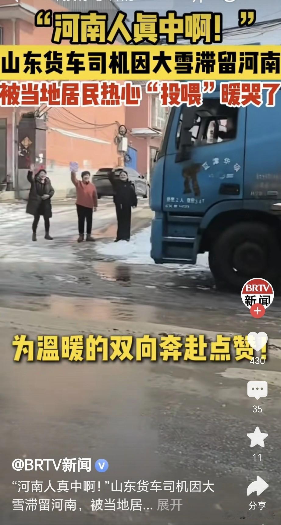 为温暖的双向奔赴点赞!一山东货车司机,因下大雪被困在了河南,司机又冷又饿,突然有人敲他车门,司机开门一看,原来是一位大姐叫他到家里吃饭,司机不好意思,大姐连忙对他说道: 我家也是开大车的,我知道跑车很不容易,饭做好时,大姐端来一碗烩面,司机的眼泪就往面里滴:这是雪中送炭,还是好人多啊! 一男子发布视频,他说着说着就开始哽咽,原来他是一位山东的大车司机,因为送货,来到了河南。 谁知他开到半路,遇到大雪天气,路上的雪一夜之间就覆盖了路面。 货车不能行驶了,只有停在一处路边,。男子在车上等待,他希望阳光能早早出来,因为他已经又冷又饿,大车上的温度越来越低了。 男子虽然穿着棉衣,可是依旧冷得手脚冰凉。 他无法上路,大把的时间漫漫难挨,男子一想,不如趁着这时,好好的睡上一会,因为睡着了,时间也能过得很快。 谁知他越睡越冷,车上翻个身都不容易,男子把衣服裹的更紧了,外面的寒风呼呼的刮着。 这时他突然听到,车外面似乎传来脚步声音,那声音越走越近,踩在雪上咯吱咯吱。 脚步声来到车前,有人在外面拍起了车门。 男子不知何事,打开车门就要询问,万万没有想到,一位大姐站在车下: 你一会去我家吃饭吧。 男子这才明白,大姐是一片的好心,担心他在车上没有热饭。 可男子不好意思,自己和大姐非亲非故,自己咋能白 吃人家的饭。 男子心里寻思,我又不认识人家,到人家家里吃饭,那又该多不好意思。 大姐看他面带迟疑,立刻就知道了他的心思。 大姐告诉他说: 我家也是开大车的,我知道跑车很不容易,一会我做好了烩面给你端过来。 大姐说完,回去继续做饭,男子愣在了车上,他的心里过意不去。 男子又想,总不能空手到人家里吃饭,他赶忙下车在附近找了个超市。 他想给大姐买点东西,进了超市,超市老板问他是不是大车上的司机?男子连连点头,不知老板问他何意? 超市的大哥大姐说道: 我给你拿点开水,晚上给你弄点菜吃,光吃方便面不行啊。 这个时候,男子才知道老板的好意,他感动不已,心里顿时有了暖意。 他绷不住了,没有想到,自己出门在外,大雪封路,他被困到了河 南的路上。 他遇到了大姐,遇到了老板,他们都是这样的热心之人,他不禁感叹,还是好人多呀! 到了吃饭的时候,大姐端出来大碗的烩面,那碗烩面热气腾腾,往男子面前一放,香味扑面而来。 男子离家多日,没想到在河南被大姐关心到了,他夹起一块烩面,半天送不到嘴里去了,因为他绷不住了,热泪盈眶,眼泪就往碗里滴了…… 男子眼圈红了,他深深的感叹,河 南 人真中啊! 司机跑车,风餐露宿,受冻挨饿那是家常便饭。 一碗烩面,虽是一碗家常便饭,可是在冰天雪地,烩面就是雪中送炭。 超市的老板,关心的语言,男子在寒冷的冬季,顿时感到不再冷了。 吃完饭后,男子把大姐家胡同的积雪,全部都给清理干净,这是善良的人遇到了善良,为温暖的双向奔赴点赞! 对此,你怎么看?