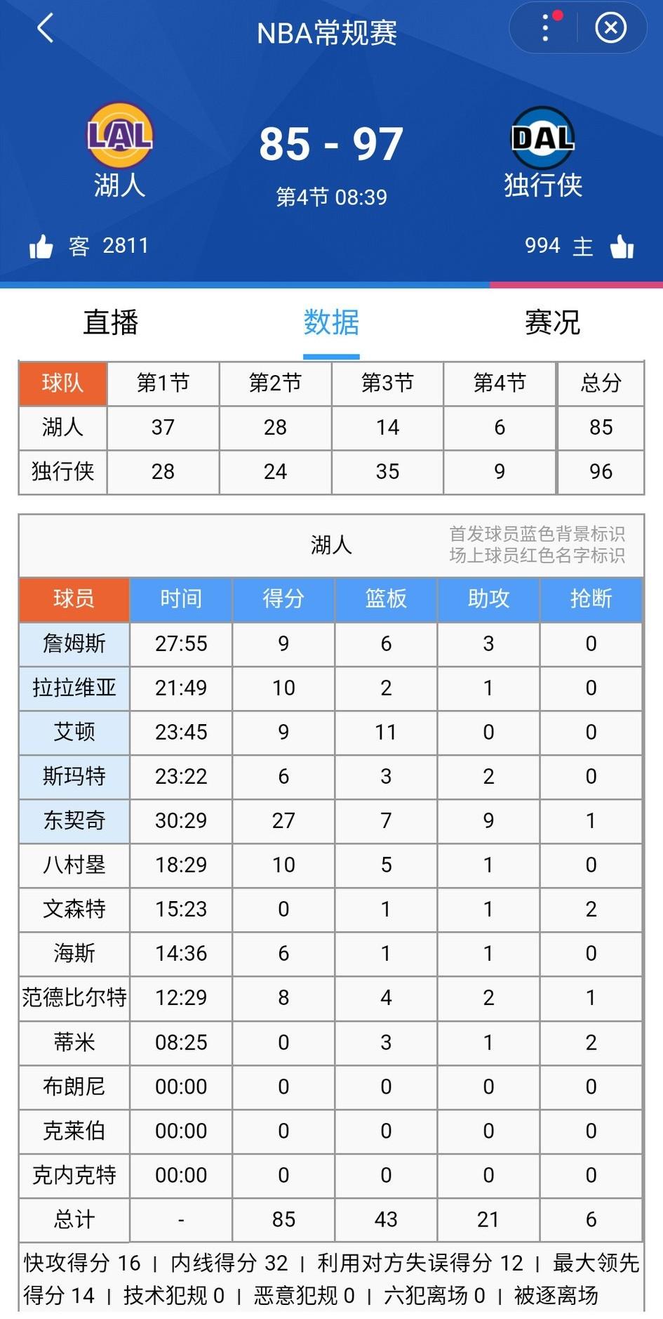 典型的湖人输球方式!湖人85-97落后独行侠12分了,从上半场领先13分到落后12分,而且比分差距还在拉大,无语…… 最后一个看点:看看赛后雷迪克在发布会上怎么逆转?