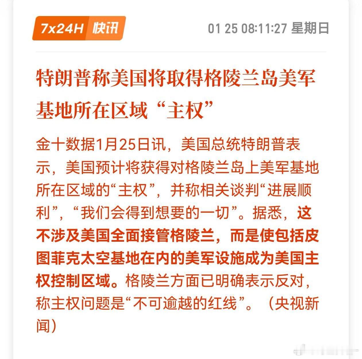 特朗普称美国将取得格陵兰岛美军基地所在区域“主权”