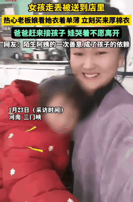 河南三门峡,老板娘收留走丢小女孩,还带她买新衣服。 等女孩爸爸来接时,小女孩抱着老板娘哭着不愿回家,这一幕,实在让人揪心。 饭馆老板娘焦女士,做自媒体小有名气。 粉丝送来走丢女孩,她发视频帮忙找家人,看女孩穿得单薄脏乱,就带她去县城置了一身新。 联系上女孩爸爸,可孩子却不愿跟爸爸走。 原来女孩家困难,妈妈残疾,她从小缺母爱。 焦女士虽只照顾女孩一时,却给了她从未有过的温暖。 这事儿看着心酸,却也暖人。焦女士的善良,给女孩的童年添了一抹亮色。 你身边有没有这种传递温暖的事儿?快来说说。