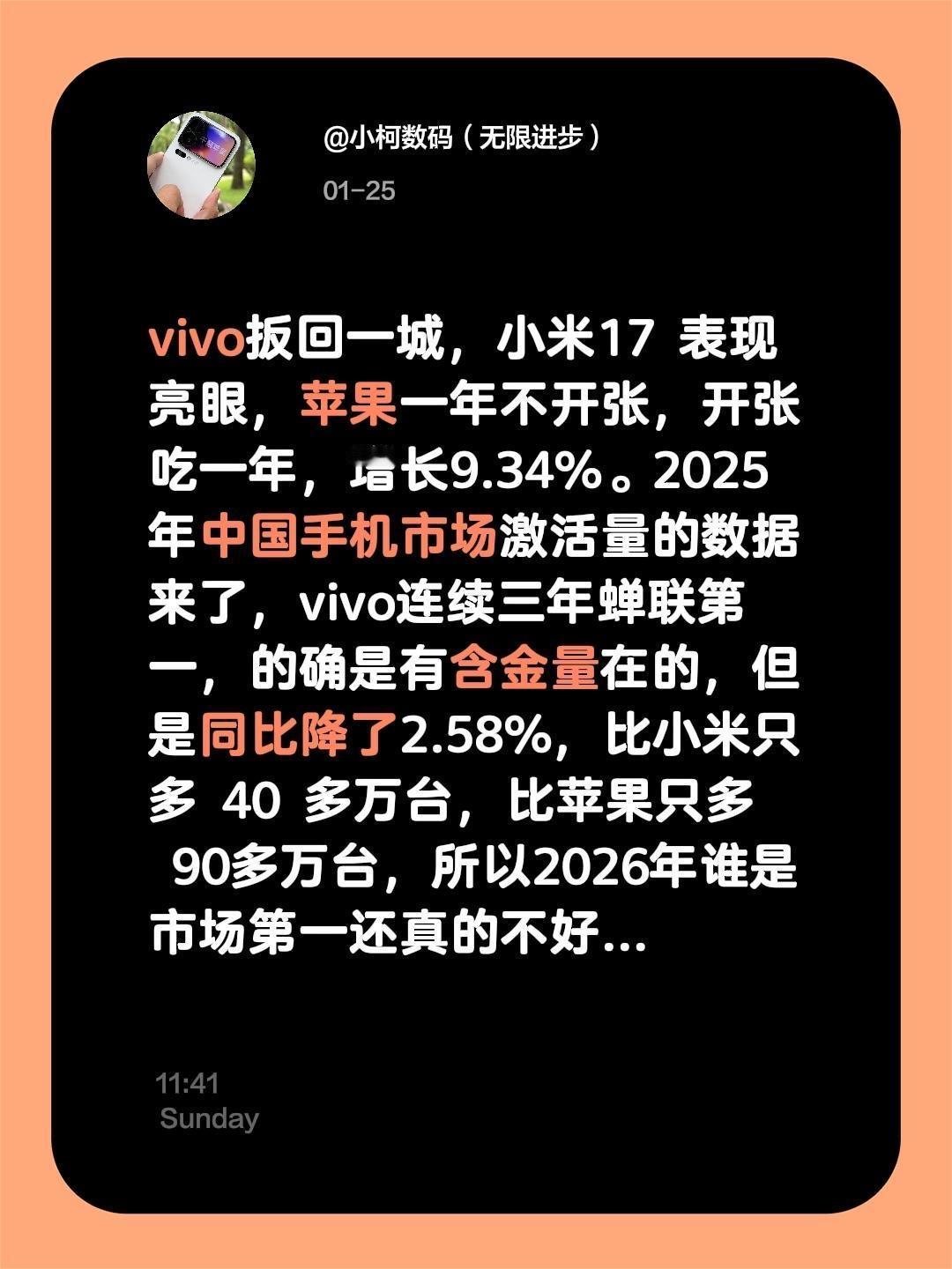 vivo扳回一城,小米17 表现亮眼,苹果一年不开张,开张吃一年,增长9.34%。2025 年中国手机市场激活量的数据来了,vivo连续三年蝉联第一,的确是有含金量在的,但是同比降了2.58%,比小米只多 40 多万台,比苹果只多 90多万台,所以2026年谁是市场第一还真的不好说。