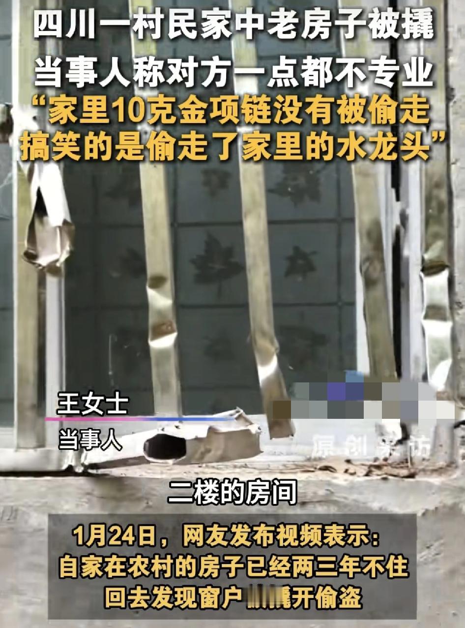 四川达州一村民发布视频称家里的老房子建好之后几年没有住人,这次回家发现家里被翘,搞笑的是家里有藏着10克的金项链没被没有被偷走,反而是家里的水龙头被偷走了。因为金项链十几年前买的,看上去有点老旧,可能小偷以为是假的。村民称小偷一点都不专业。大家评论,千万不要挑战小偷的专业性,只是这一次侥幸罢了,而且老房子真的不要放贵重的物品。