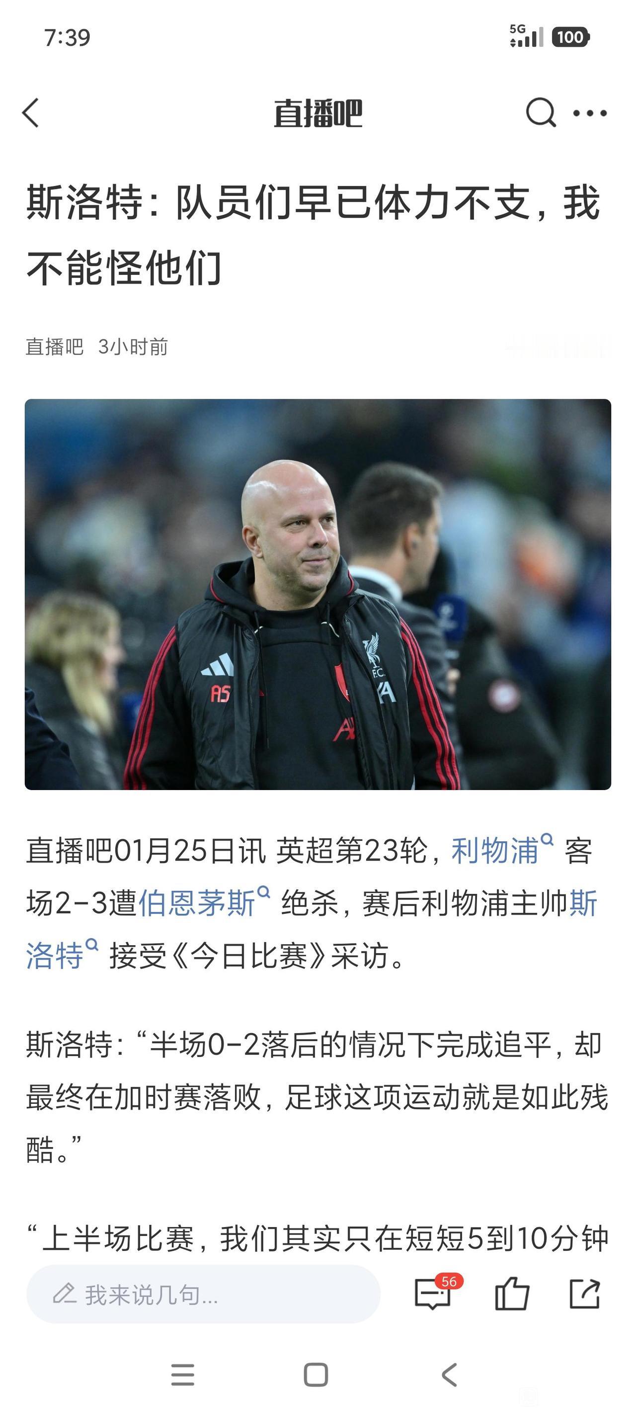 每一次加时利物浦被击败,斯洛特都找理由,这次是队员体力不支。 为什么对方体力很好能绝杀呢? 他要是去年这样,利物浦就换教练了,到底换不换利物浦很烦恼。[思考]