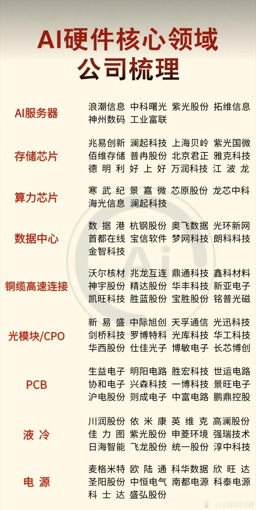 当GPT-5的参数规模突破万亿,当国产算力芯片在国际赛场实现突围,AI硬件的竞争早已从实验室走向了产业最前线。这份AI硬件核心领域的公司图谱,正是中国科技力量在全球算力军备竞赛中的“作战沙盘”。在AI服务器赛道,浪潮信息、中科曙光们不仅是国内算力基建的主力军,更在全球份额中紧追戴尔、HPE,用“中国速度”改写着全球AI算力的供给格局。存储芯片领域,从兆易创新的NOR Flash到江波龙的企业级存储,本土企业正从消费级市场向工业级、车规级发起冲击,在ChatGPT引发的数据爆炸中抢占存储高地。算力芯片的突破更令人振奋,寒武纪、海光信息们的迭代速度,让“中国芯”不再是遥远的口号,而是支撑大模型训练的硬核底气。光模块与CPO技术的演进正在重塑数据传输的物理边界。中际旭创、新易盛们凭借800G产品的先发优势,在全球AI流量爆发期吃下了最大的红利,而CPO技术的商用突破,更将为未来1.6T、3.2T时代埋下伏笔。液冷与电源技术的革新同样不容忽视,当AI服务器单机功耗突破10kW,依米康、高澜股份们的高效散热方案,正在成为数据中心“碳中和”目标的压舱石。未来三年,AI硬件的竞争将进入“技术硬实力+场景适配力”的双维度比拼。一方面,Chiplet、3D堆叠等先进封装技术会成为国产芯片追赶的重要跳板;另一方面,AI与工业制造、自动驾驶的深度绑定,将催生更细分的硬件需求。对于这些企业而言,真正的挑战不仅是技术突破,更是如何在全球供应链重构中,守住核心产能的同时,建立起从底层技术到终端场景的完整生态。当我们看到华为昇腾芯片支撑起全国算力网络,看到液冷技术让数据中心PUE值跌破1.1,不难发现:中国AI硬件产业正从“跟跑者”向“并跑者”加速蜕变,而那些能在技术储备、供应链韧性和场景创新上形成合力的企业,终将成为下一个算力时代的“造风者”。