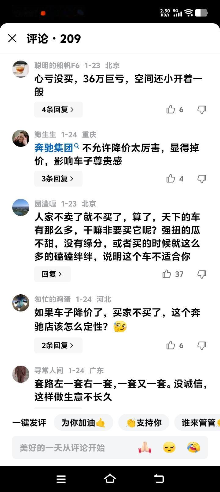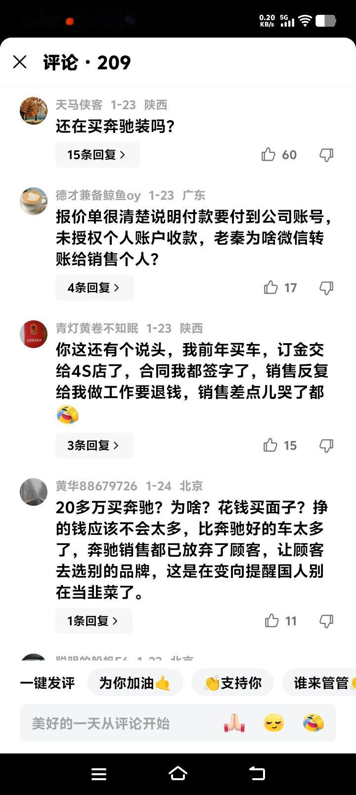 嘉兴桐乡奔驰4S店惊天套路:男子转账五千定金备注“定金”竟被退回,销售一句“收到”成空话,回家过年的体面碎了一地! (来源:1818黄金眼) 签了字的报价单墨迹未干,微信转账的五千块钱备注着醒目的“定金”二字,销售一句“收到”让重庆秦师傅满心欢喜,以为新年开奔驰回老家的梦稳了。谁知二十四小时后,钱款原路退回,嘉兴桐乡利之星奔驰4S店换了一副面孔:价格太低,这车卖不了!白纸黑字抵不过一句“报价单不是合同”,消费者的信任在年关前被碾得粉碎。 从“集团未批”到“车子涨价”,店方的理由一日三变。秦师傅夫妻在浙江打拼,心心念念想开辆崭新的奔驰C350eL回重庆过年,谈妥的落地价二十六万零三百元,包含了旧车置换的一万五国补。销售主管亲手写下价格,双方郑重签名,一切看起来板上钉钉。那五千块钱转账,是诚意,更是契约的起点。 法律人士一针见血:这或是行业内心照不宣的“钓鱼式销售”。先用诱人低价稳住客户,签下非正式文件,再去内部申请。若上级嫌利润薄,或遇更高出价者,便以“未审批”“价格变动”为由推翻前约。风险全由消费者承担,而商家始终手握退路。那张签了字的报价单,在商家眼里成了可随意撕毁的草稿。 “收到”二字在数字时代承载着何种重量?销售迅速回复“收到”,却在二十四小时内放任转账自动退回,辩称“只是看到信息,并非确认收款”。这轻飘飘的解释,击碎的是数字时代最基本的交易信任。若每句“收到”都可事后解释为“仅表示已阅”,线上沟通的确定性何在?消费者的安全感何在? 更深层看,这折射出部分豪华品牌门店的傲慢心态。车不愁卖,便视单个消费者的权益为无物。流程漏洞成为推诿的借口,“内部审批”成了挡箭牌。那句“价格要双方沟通最终确定”,实则是将白纸黑字的议价成果置于可任意反悔的灰色地带。商业信誉在销售指标面前,似乎轻如鸿毛。 秦师傅的遭遇并非孤例。多少消费者在购车时遭遇“低开高走”、交车延期、赠品缩水?取证难、维权成本高,让许多人最终选择忍气吞声。这起事件之所以引爆网络,正是因为它戳中了大众心中那根关于“公平交易”的敏感神经。当签字都不算数,我们还能相信什么? 年关将至,购车本是件喜庆事。商家或许算准了消费者时间紧迫、不愿纠缠的心理,赌你会妥协。但秦师傅选择了曝光,选择了较真。这不仅仅是为五千块钱,更是为一句公道。当品牌的光环遮不住诚信的缺口,所谓的“豪华体验”便成了最大的讽刺。 截至发稿,双方仍未达成和解。秦师傅已心寒,转而考虑其他品牌。而这家4S店失去的,远不止一单生意。在信息透明的今天,每一个敷衍的“收到”,每一次出尔反尔,都在社交网络里发酵,最终反噬品牌自身。诚信是生意的底线,不是选择题。你的每一次选择,都在为想要的市场投票。 奔驰定金纠纷 购车套路揭秘
