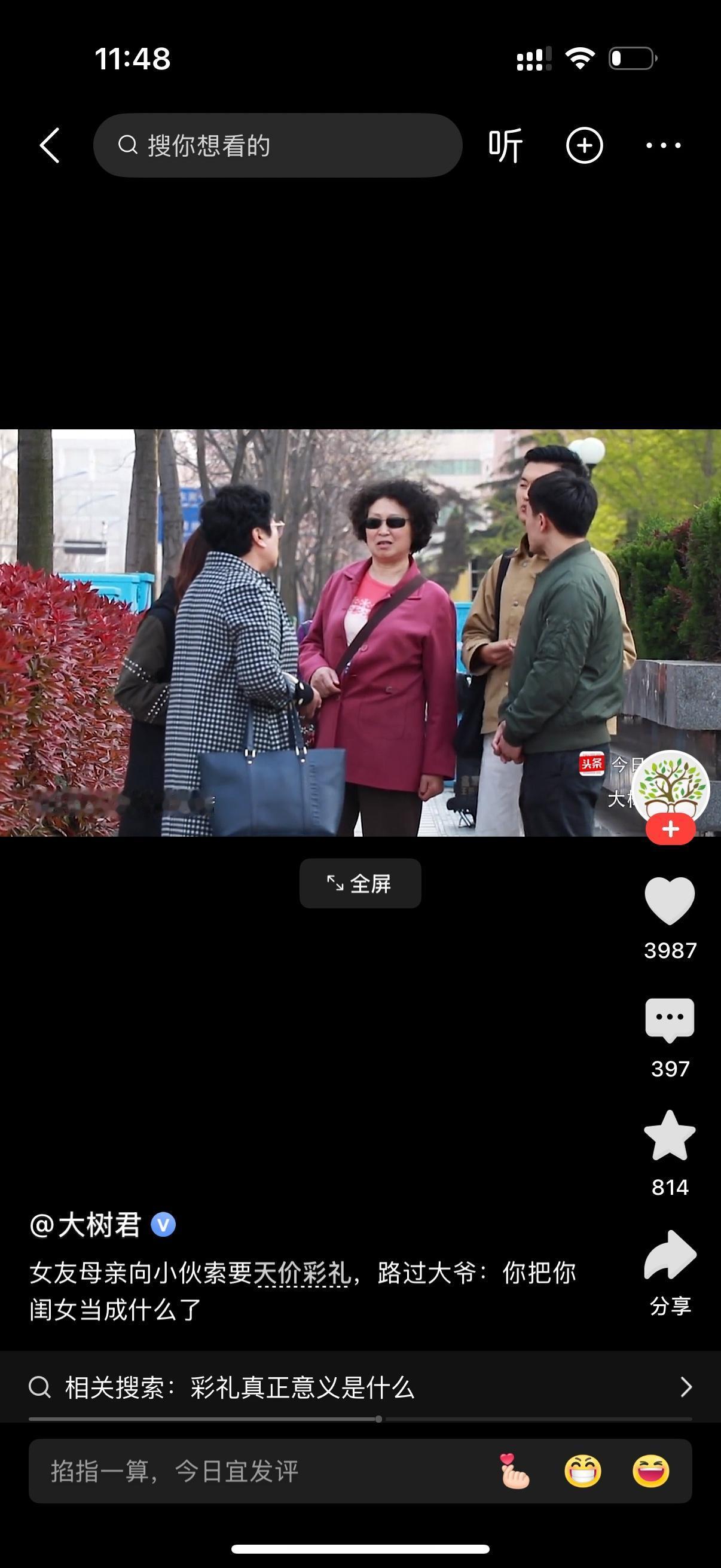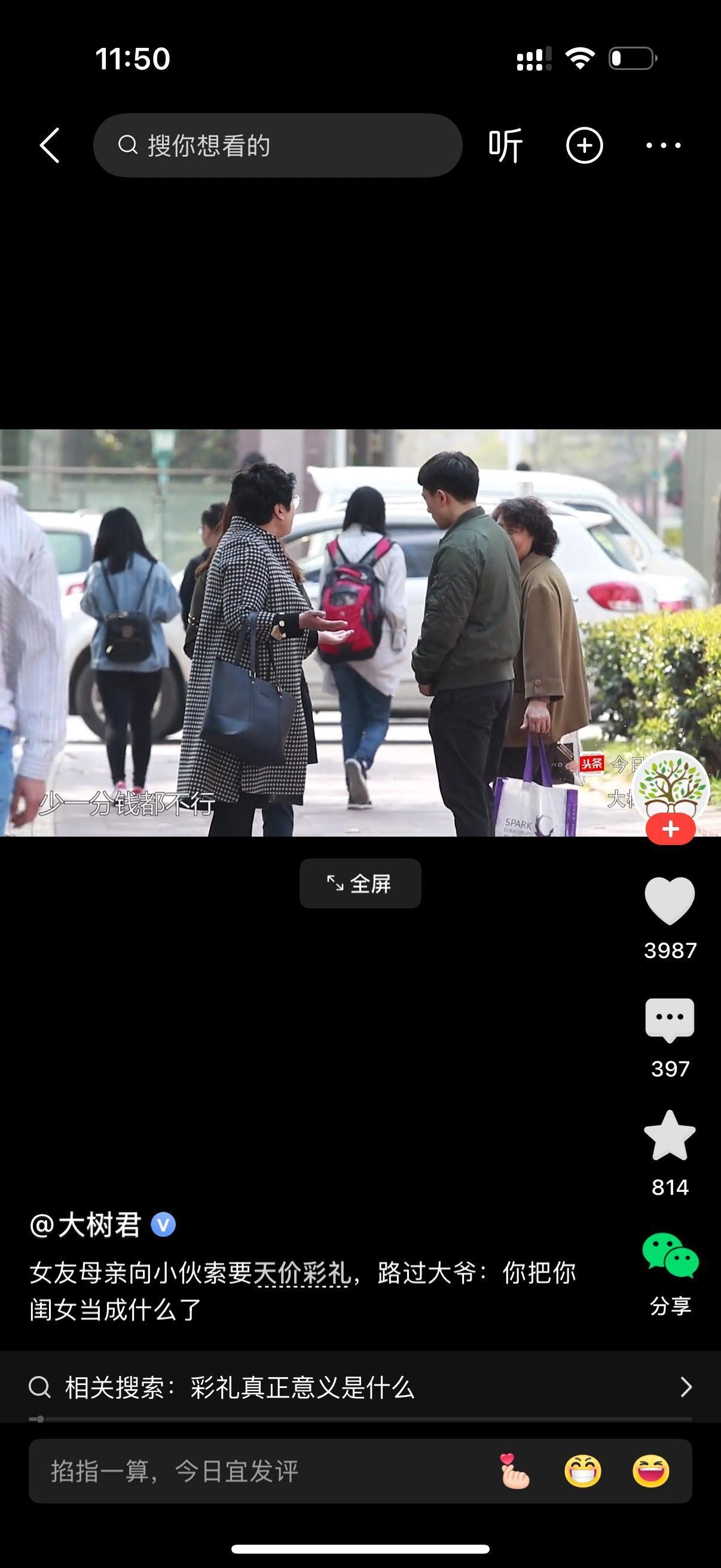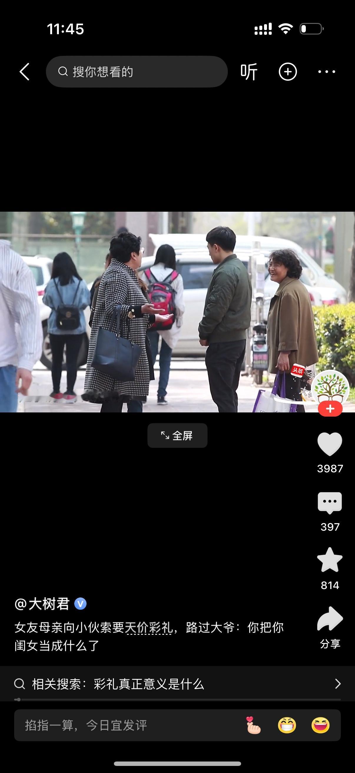 女友母亲在大街上向小伙索要天价彩礼,定亲情28万8,少一分钱都不行。小伙一脸愕然,站在路边手足无措。路人看到这一切,纷纷为小伙说情。他们劝女孩母亲,不要棒打鸳鸯,现在的小孩都不容易。还有人说自己的女儿就是和女婿裸婚,现在房车也啥都有了。女友母亲却不吃这一套,她说以后的事情谁知道,他有没有出息谁知道?我要的是现在,是当下。好像都有道理,都没错。哎,男孩还是赶紧准备钱吧。有了钱一切好说。