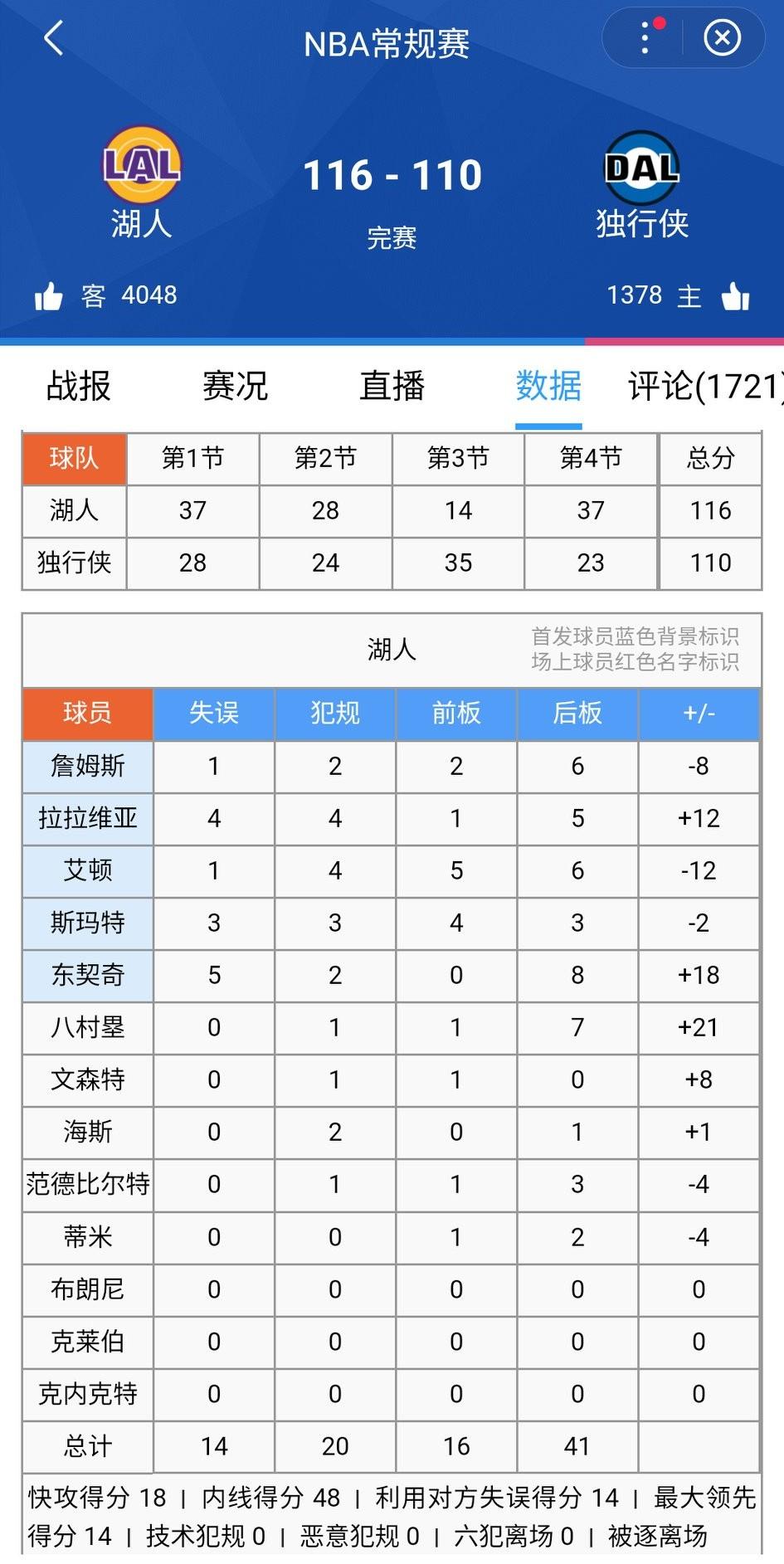 湖人能成为流量队是有说法的:你觉得他行了,他立马拉了;你觉得他拉了,他立马又行了。 湖人客战独行侠,还是熟悉的过山车流程,湖人领先独行侠10多分,然后又落后独行侠10多分,最后第四节再度翻盘居然116-110赢了。 湖人从第三节开始一度被打41-14,最后7分半一波29-8反超赢球,又拿下一场关键时刻的比赛。 第四节詹姆斯立下大功,唯一难看的是正负值还是负数,全队倒数第二,第一是顿宝。