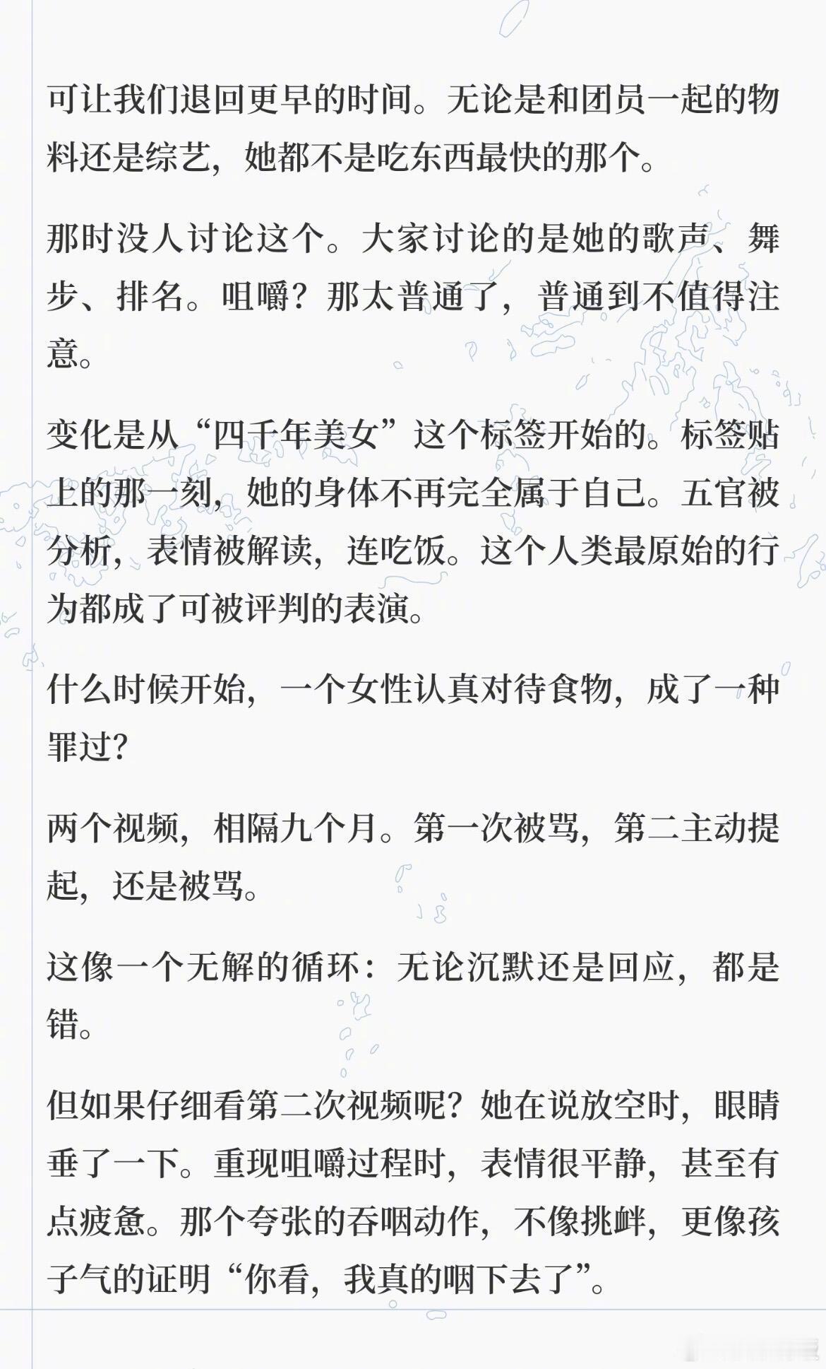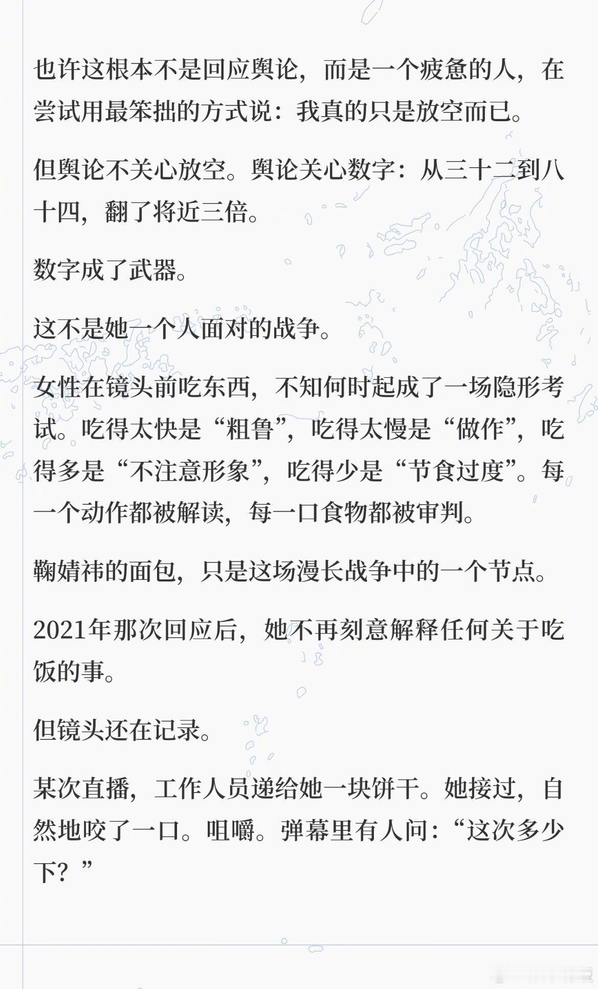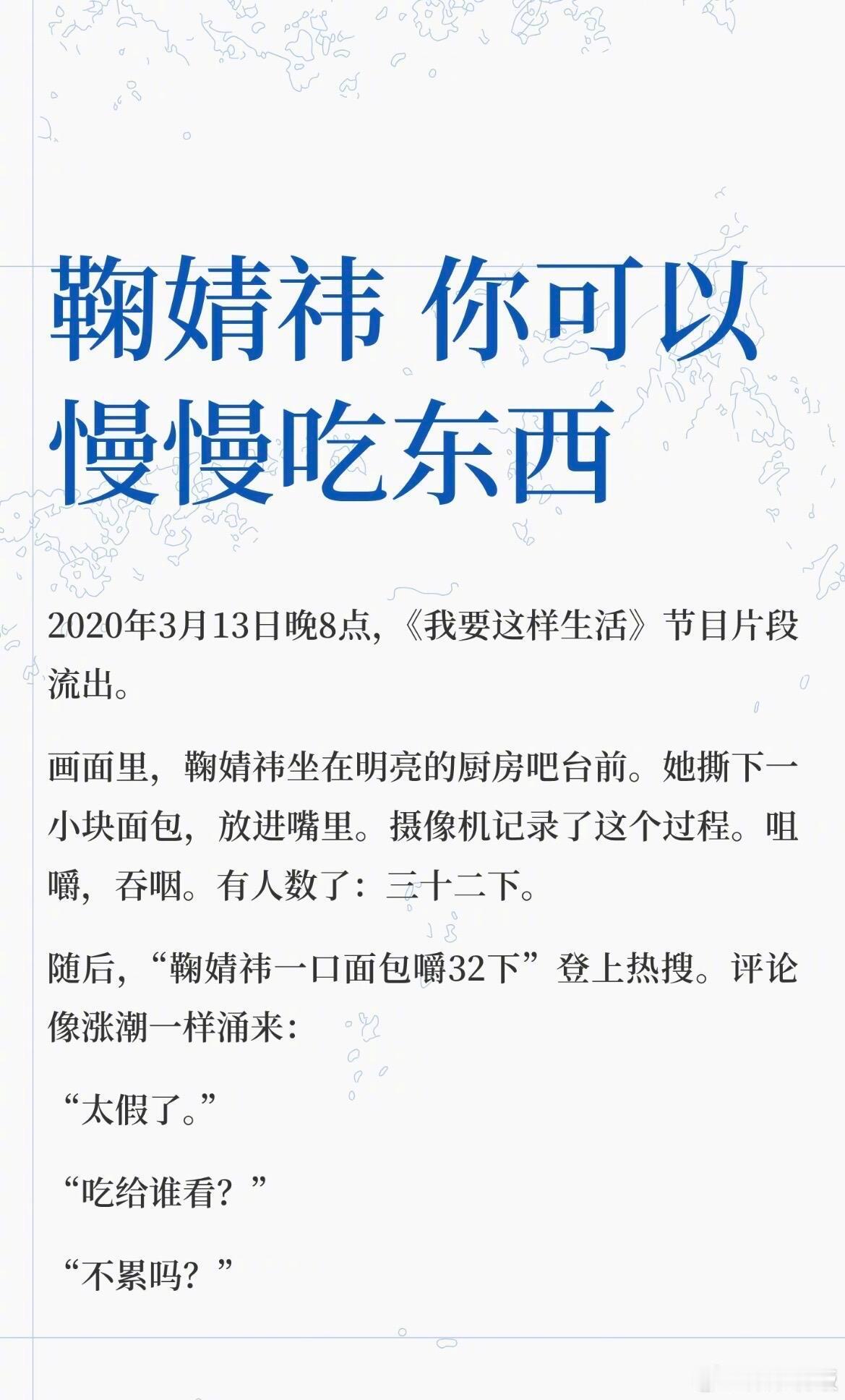 鞠婧祎 不辩解不改变只是继续鞠婧祎 你可以慢慢吃东西 看完博主为鞠婧祎写的长文,再次感叹鞠婧祎的含金量:一口面包嚼 32 下被骂 “假”,主动解释放空嚼了 84 下又被说 “挑衅”,可她只是默默按自己的节奏生活 —— 直播里自然咬饼干说 “有点甜”,片场安静吃简餐时,反而收获了 “多吃点” 的温柔评论。社会总给女性套上 “吃太慢做作、吃太快粗鲁” 的枷锁,可鞠婧祎不辩解、不改变,只守着 “我的嘴我的节奏我决定” 的自在。这种在潮水般评判里守住身体自主的日常坚持,比任何激烈反抗都有力量 鞠婧祎