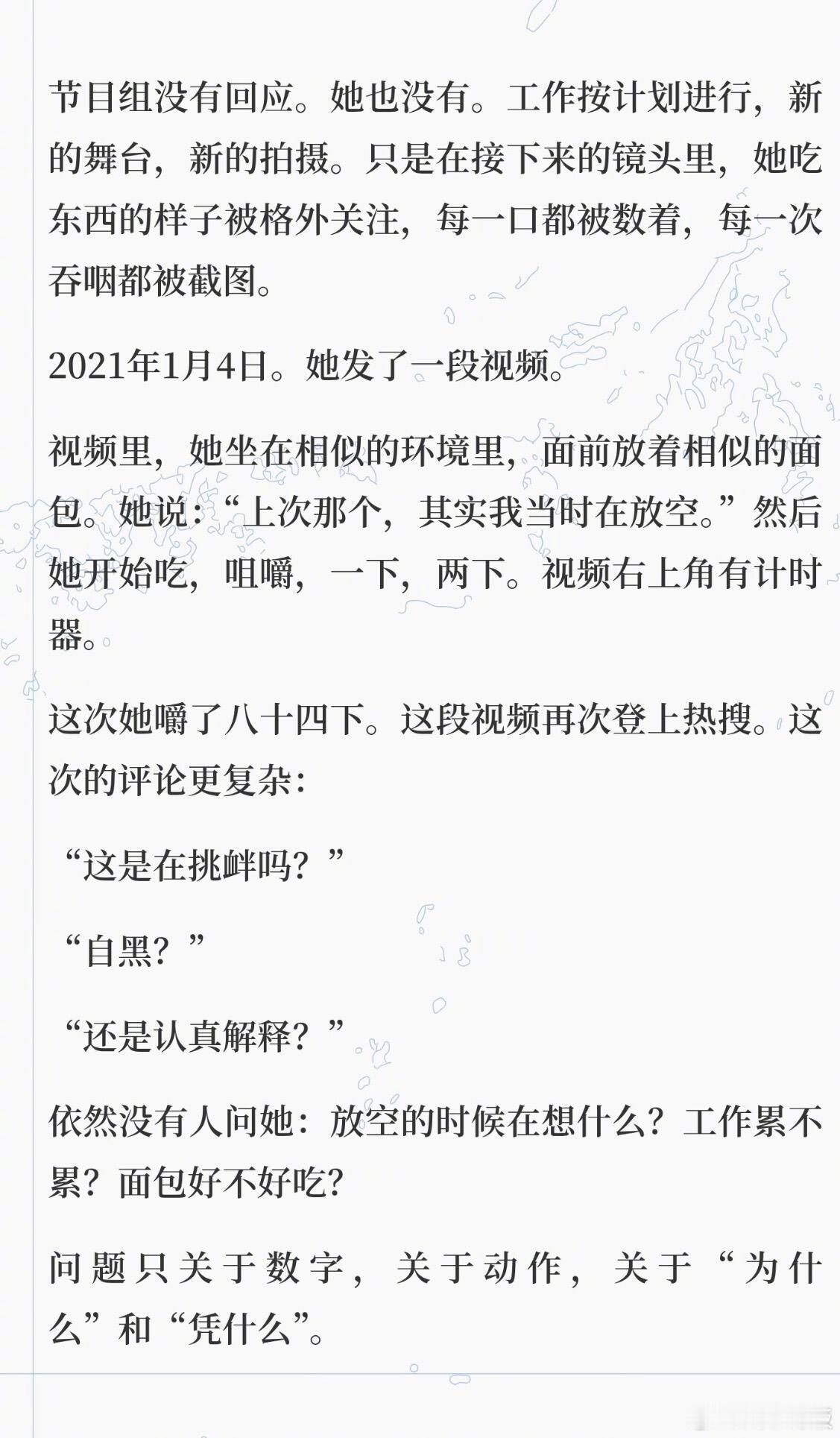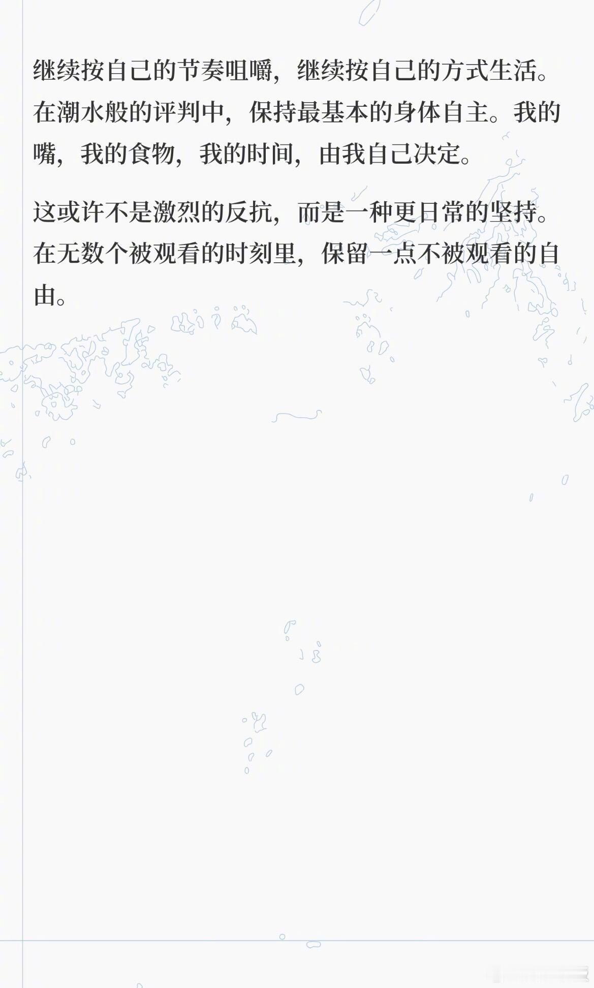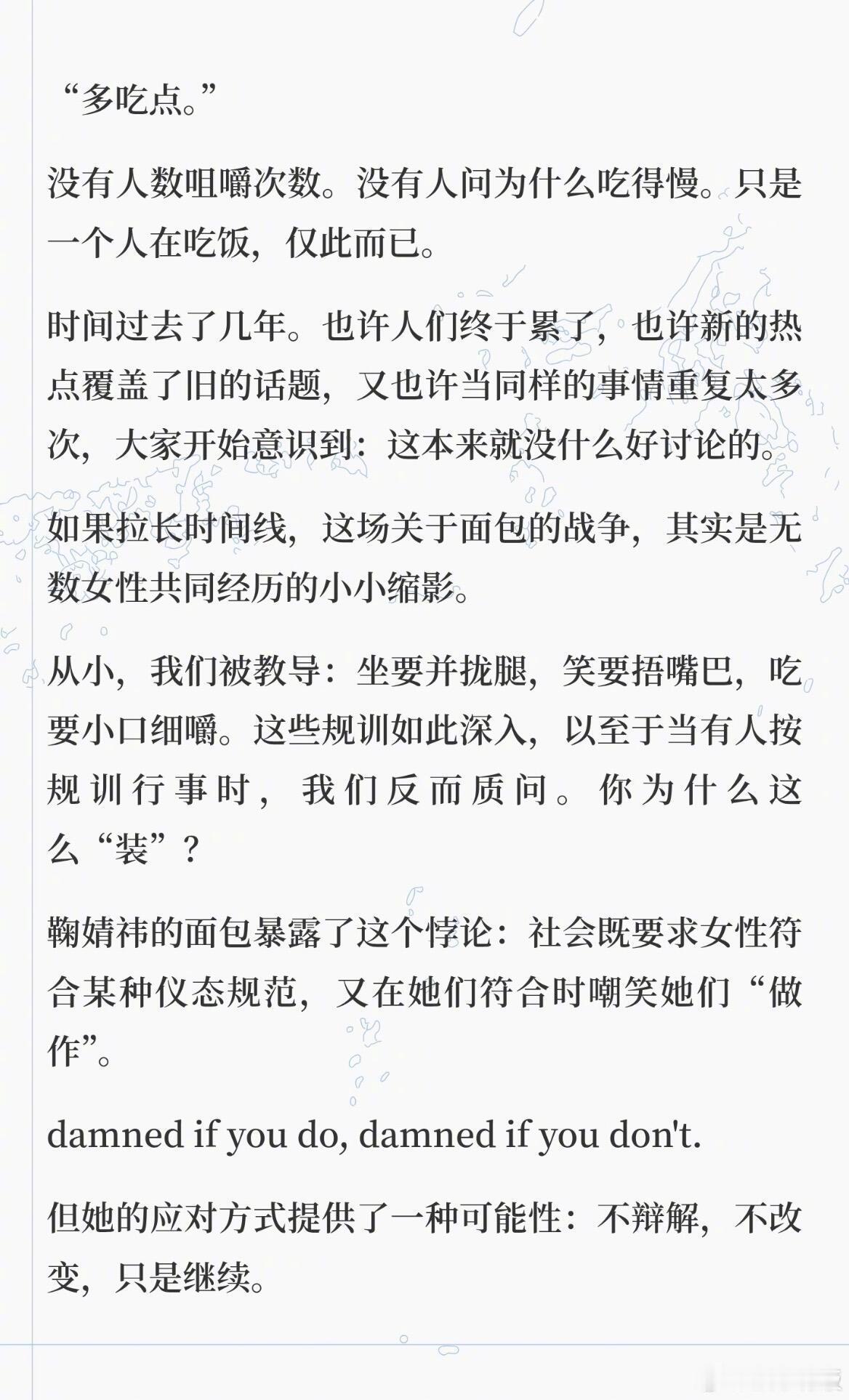 鞠婧祎 不辩解不改变只是继续鞠婧祎 你可以慢慢吃东西 看完博主为鞠婧祎写的长文,再次感叹鞠婧祎的含金量:一口面包嚼 32 下被骂 “假”,主动解释放空嚼了 84 下又被说 “挑衅”,可她只是默默按自己的节奏生活 —— 直播里自然咬饼干说 “有点甜”,片场安静吃简餐时,反而收获了 “多吃点” 的温柔评论。社会总给女性套上 “吃太慢做作、吃太快粗鲁” 的枷锁,可鞠婧祎不辩解、不改变,只守着 “我的嘴我的节奏我决定” 的自在。这种在潮水般评判里守住身体自主的日常坚持,比任何激烈反抗都有力量 鞠婧祎