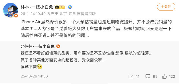 荣耀高管称iPhoneAir将彻底死透荣耀高管真是迷之自信,天天在网上炮轰iPhone Air,但是自己家的Air大概率卖不过他嘴里拉到家的iPhone Air,到时候也只会装死。这种营销方式太败人品了,照着iPhone Air抄,还骂人垃圾,真是脸都不要了老张聊数码