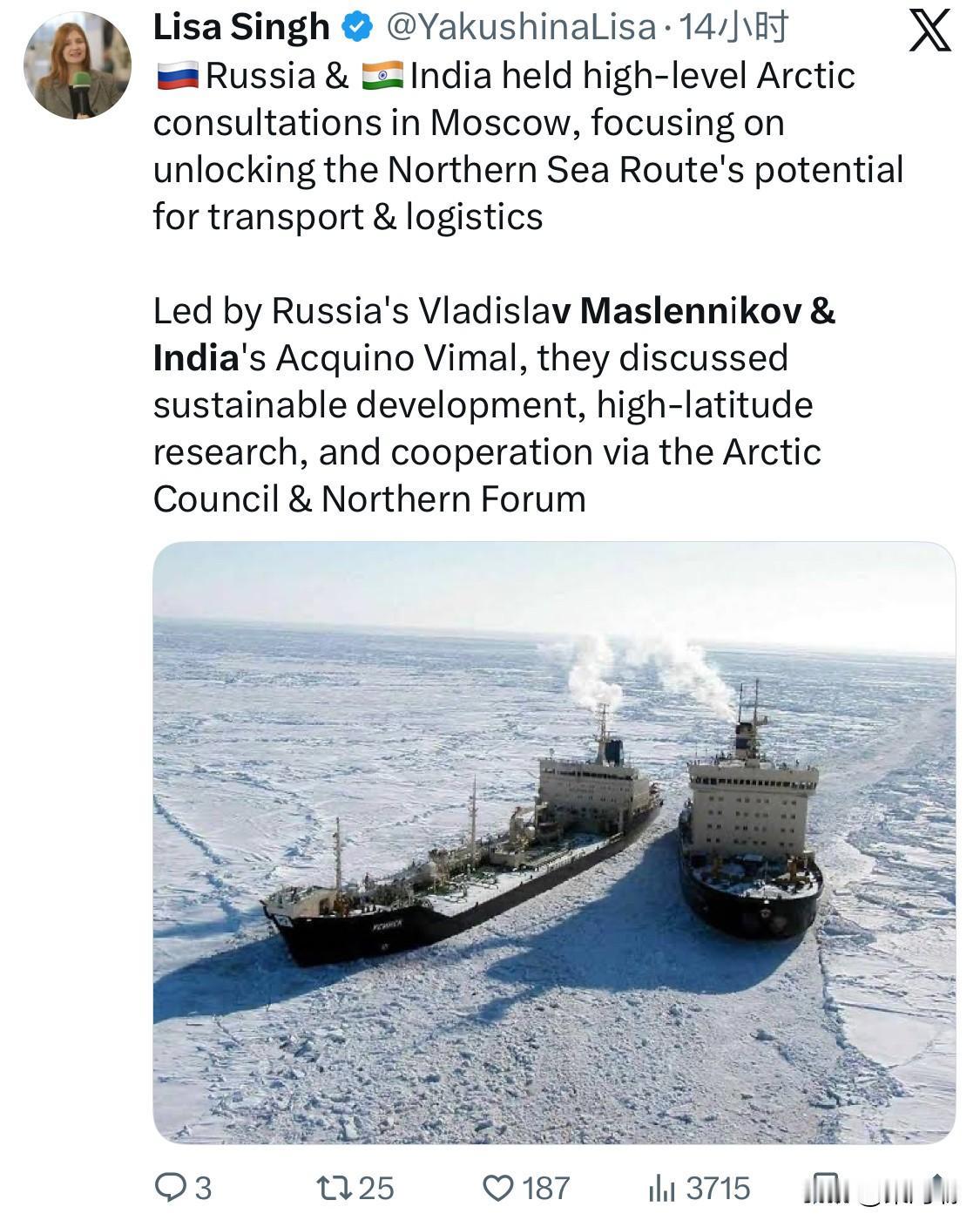 俄罗斯和印度高级官员近日在莫斯科举行了北极磋商,重点讨论了北方海路的发展和合作。 磋商要点 可持续发展: 讨论了北极地区的可持续经济发展。 北方海路: 重点在于释放北方海路的运输和物流潜力。该航线比通过苏伊士运河的传统航线短约30-40%,可节省时间和成本。 研究合作: 双方同意扩大高纬度研究方面的合作。 多边平台: 强调通过北极理事会和北方论坛等多边平台协调努力。 地区稳定: 双方强调维护该地区的和平、稳定和非对抗性议程的重要性。 主要官员: 磋商由俄罗斯高级北极理事会官员弗拉迪斯拉夫·马斯列尼科夫(Vladislav Maslennikov)和印度外交部高级官员阿基诺·维马尔(Acquino Vimal)共同主持。