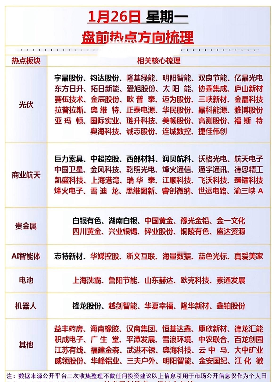 1月26日盘前热点方向梳理,把握市场趋势! 光伏领涨,商业航天活跃,贵金属走强,AI与电池受关注,机器人异动,医药农业等板块轮动。 光伏、航天、贵金属、AI智能、电池、机器人等板块热点轮动,宇晶、钧达、隆基等个股活跃,市场聚焦新能源与科技赛道