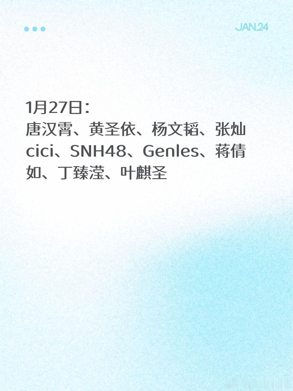 东方卫视春晚嘉宾录制🍉1月27日:唐汉霄、黄圣依、杨文韬、张灿cici、SNH48、Genles、蒋倩如、丁臻滢、叶麒圣1月30日:孙天字、松天硕、王建华、张泰维、欧剑宇、李维、刘思维、尹贝希、应采儿、Jasper、Hoho、陈小春、萧敬腾 小鹿、翟佳宁、门腔、Norah、哈瑞、孙樾、赵钱龙、吴志军、张玮伦2月2日:陈楚生、胡海泉、石倚洁、黄英、胡彦斌、宋思衡、宋小宝、文松、王奕婷、芭比