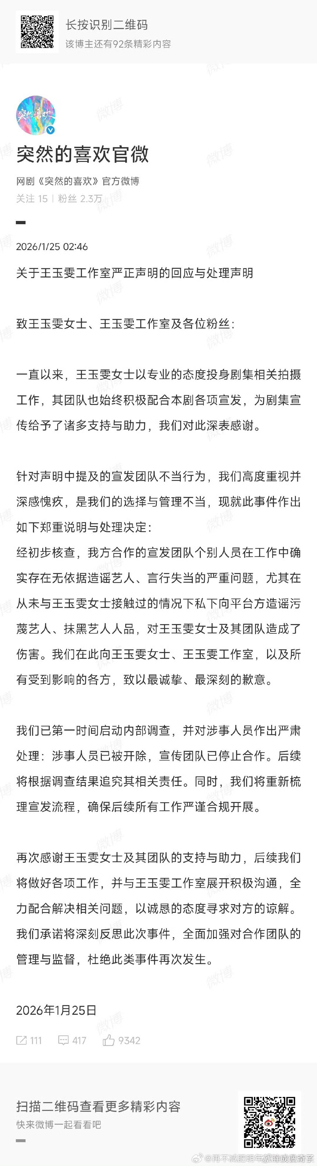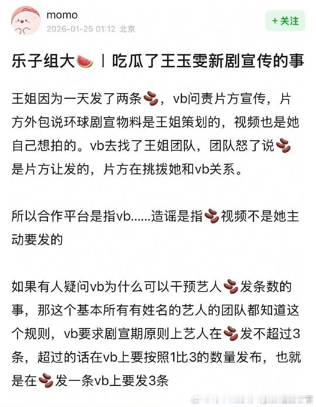 vb潜规则:剧宣期间一天不能发超过三条🫘,超过了要按1:3在微博补回来这点比较吸粉圈睛但王玉雯明显就像凤凰台血扑的时候彭小苒和作者吵架一样,血扑剧里硬造水花的感觉