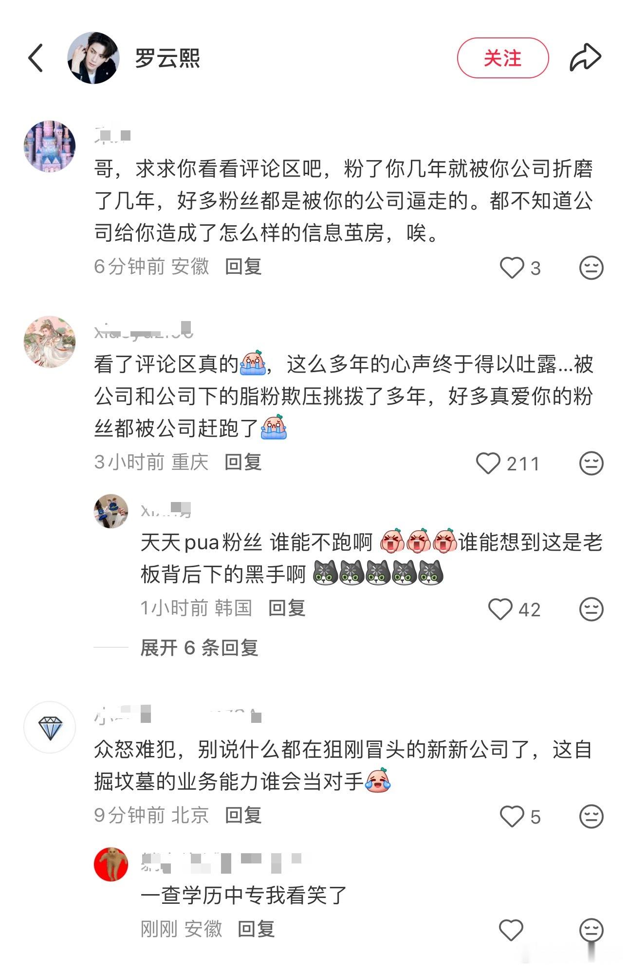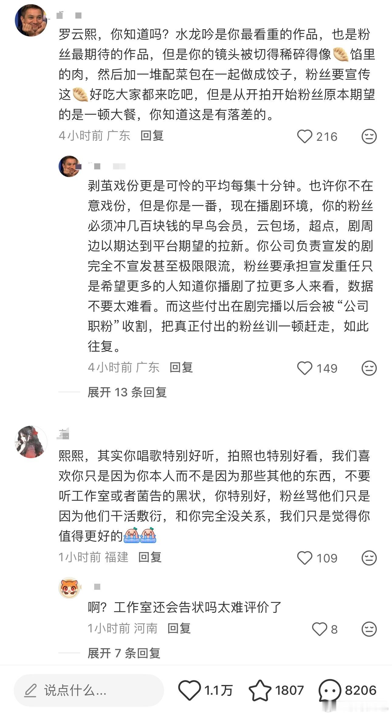 罗云熙粉丝冲了罗云熙前排在求解约,因为水龙吟和剥茧镜头戏份碎片化真的伤到粉圈了…