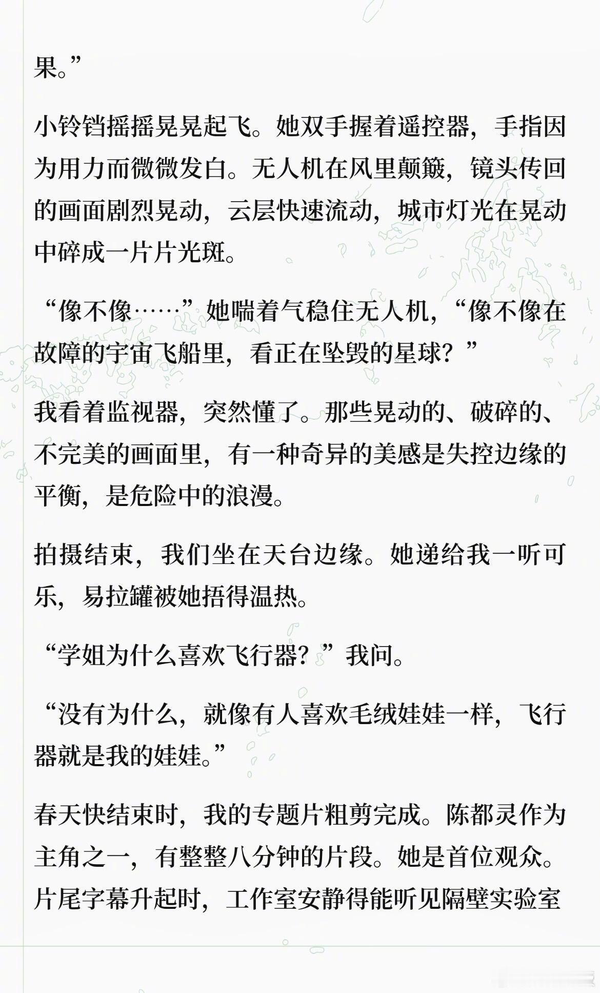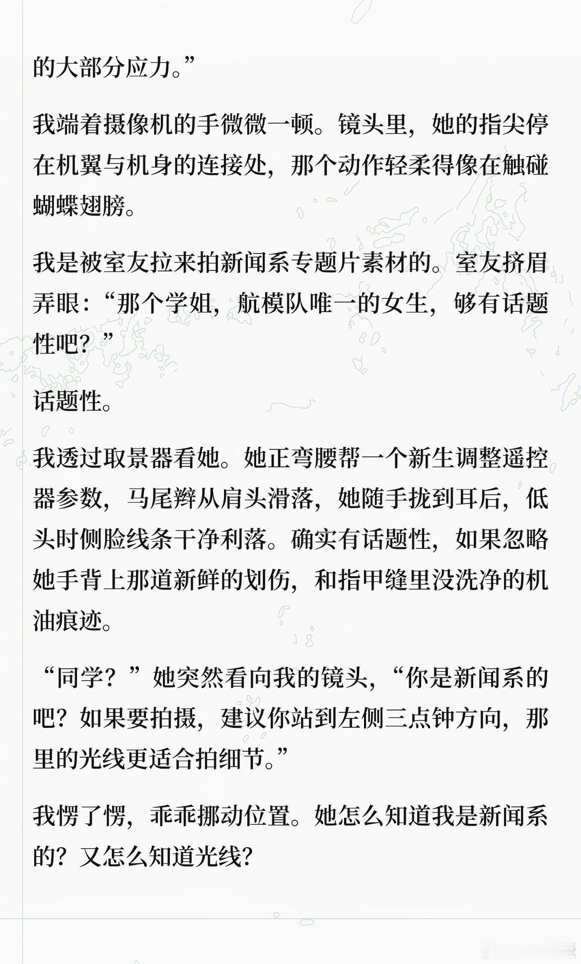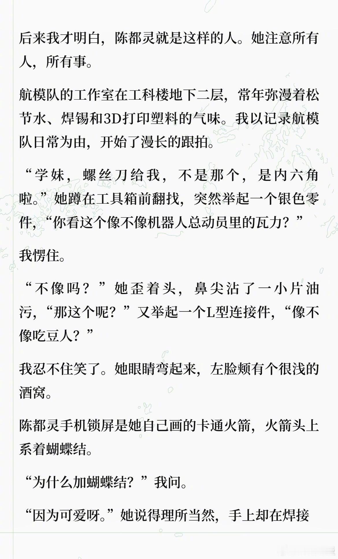 假如陈都灵真的在南航造飞行器 找到一篇博主写的的陈都灵的“梦女文”,看完直接被戳中 “航模队唯一的女生陈都灵,穿洗发白的队服、指尖带着机油痕迹,讲碳纤维加强肋时语气温和,却能精准指出拍摄的光线角度;会把零件盒叫 “梦想的补丁”,手机锁屏是带蝴蝶结的卡通火箭,焊铝板时火花溅起也不眨眼......” 如果真的遇到这样的嘟嘟,真的会心动