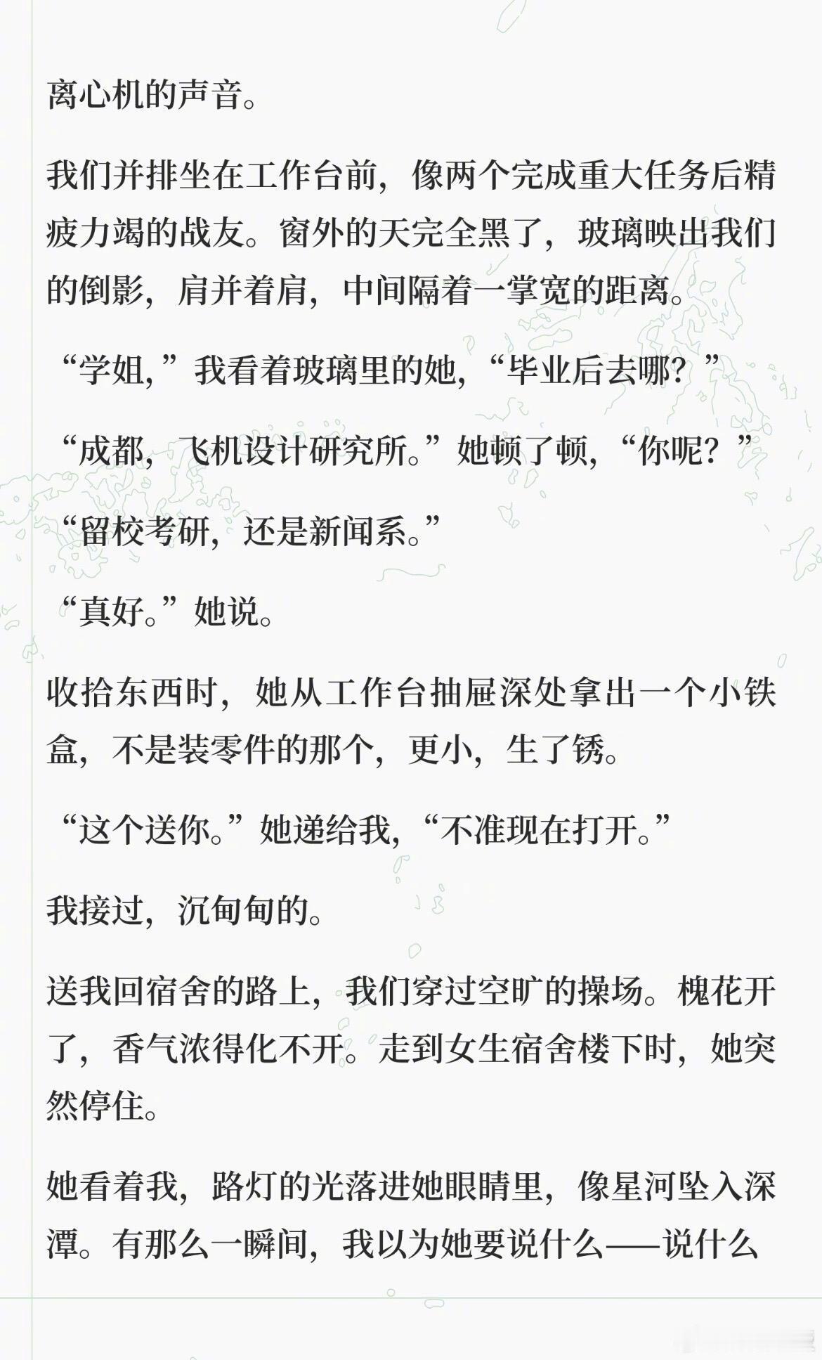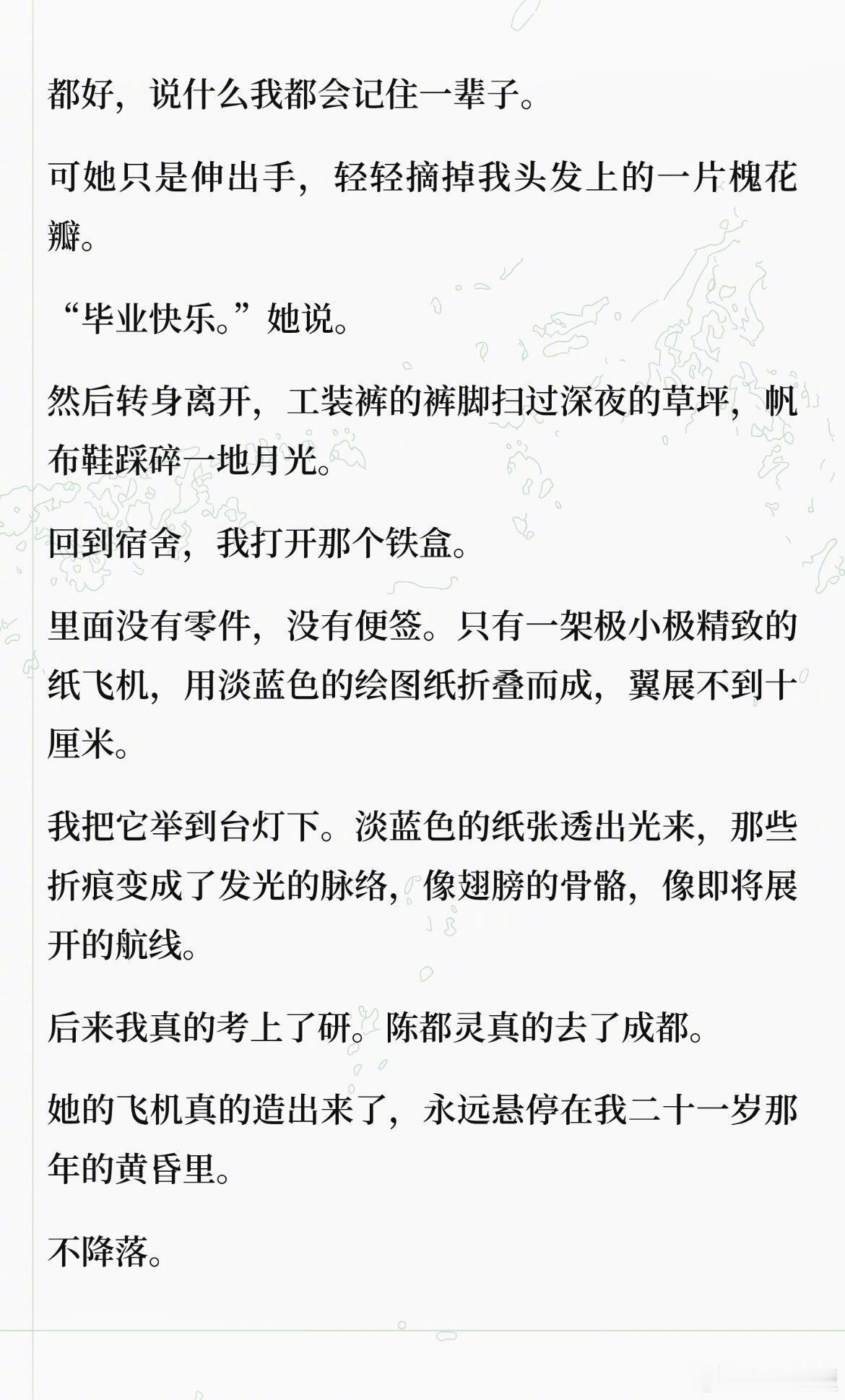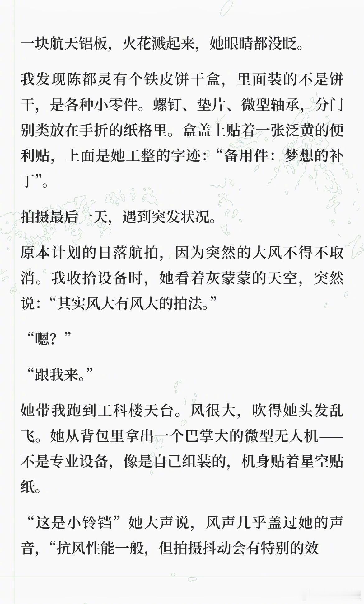 假如陈都灵真的在南航造飞行器 找到一篇博主写的的陈都灵的“梦女文”,看完直接被戳中 “航模队唯一的女生陈都灵,穿洗发白的队服、指尖带着机油痕迹,讲碳纤维加强肋时语气温和,却能精准指出拍摄的光线角度;会把零件盒叫 “梦想的补丁”,手机锁屏是带蝴蝶结的卡通火箭,焊铝板时火花溅起也不眨眼......” 如果真的遇到这样的嘟嘟,真的会心动