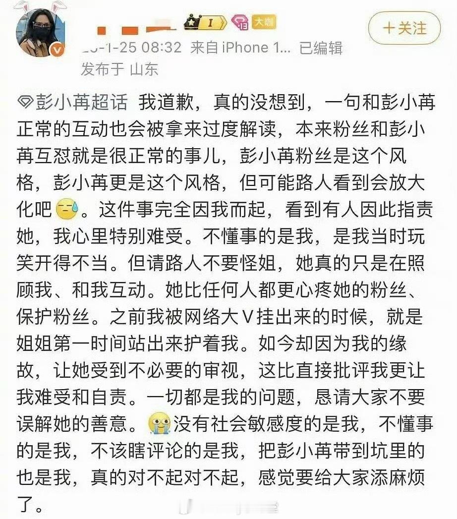 彭小苒祝粉丝天天加班,然后粉丝发文道歉了,说自己不懂事,玩笑开得不得当……竟然是粉丝发文道歉吗😅彭小苒 祝你天天加班