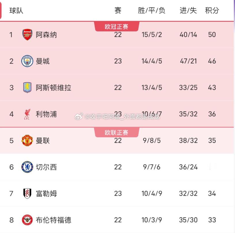 英超第23轮本周末打响,利物浦2-3惨遭伯恩茅斯绝杀,曼城2-0狼队。在最新的积分榜中,阿森纳少赛一场,目前积50分,领先第二名的曼城4分,维拉、利物浦暂列三四位,曼联少赛一场排在第五,球队明天凌晨与阿森纳上演焦点战。