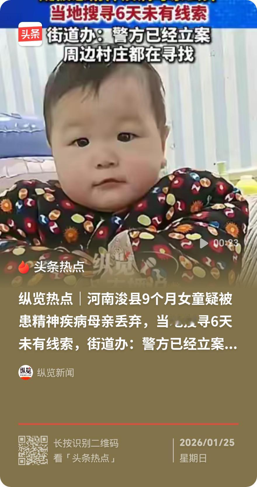 揪心!河南9个月女婴被亲妈遗弃河堤,零下低温失踪6天,背后隐情曝光 河南浚县一出事,全网都揪着心!1月16日下午,一名9个月大的女婴被亲生母亲扔在人民医院西侧的河堤上,如今已经失踪6天,生死未卜。 监控记录下残酷一幕:当天母亲骑电动车带娃沿河堤行驶,把孩子放在腿间板凳上,半小时后独自返回,孩子、板凳和挡风被全没了踪影。孩子父亲陈先生起初以为妻子只是带娃买东西,一句“天快黑了别乱跑”竟成暂别遗言,直到联系不上才报警。 更让人上火的是背后隐情:陈先生经媒人介绍结婚,婚前完全不知道妻子有精神疾病,媒人和女方家刻意隐瞒。直到妻子怀孕后,自言自语、离家出走的症状显现,拿出精神残疾证他才知情。出事前虽已叮嘱妻子吃药,却还是没能阻止悲剧。 目前警方已立案,街道办发动村民全力搜寻,找到的只有板凳和挡风被,穿黑底斑点棉袄的女婴仍无音讯。浚县夜间气温跌破零下,婴儿毫无自保能力,每分每秒都面临危险。 从法律上说,遗弃婴幼儿已涉嫌遗弃罪,情节恶劣可判五年以下刑罚。母亲的精神状况虽需司法鉴定,但孩子成了婚姻隐瞒的牺牲品。这事儿也提醒大家,婚姻坦诚是底线,精神疾病患者的监管和治疗绝不能含糊,愿奇迹出现,孩子能平安回家!河南男孩失踪 2岁半失踪女童 河南失踪人