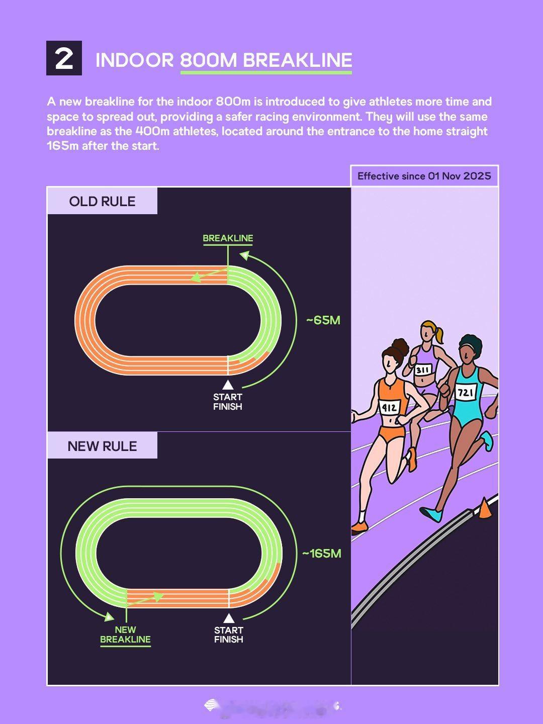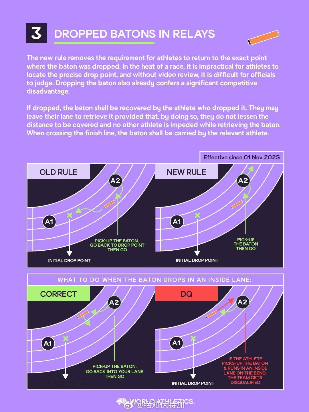 世界田联2026年1月公布室内(短道)锦标赛新规:1、室内400米,预赛每组只安排4人跑3-6道,1-2道空置以降低硬件上的不公。2、室内800米并道将原规则的起跑65米后改为400米相同的起跑165米后,提升赛事的安全性。3、接力跑掉棒后无需再跑回准确掉棒点,由掉棒者直接捡起接力棒继续前进即可;弯道掉棒不可以在内道继续跑,必须捡起后立即回到本队道次。4、4x400米和4x800米接力,第2-4棒选手等候次序不再对应上一棒最后100米处,而是对应上一棒最后200米通过次序。室内田径 短道田径 接力赛
