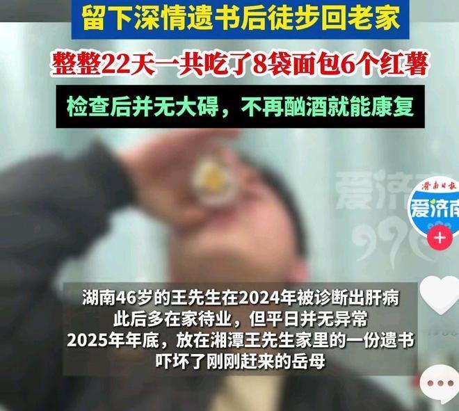 46岁男子因肝病留遗书徒步22天,竟奇迹般平安归来,这背后究竟隐藏着怎样的故事? 46岁的王安顺,因肝病被迫中断工作,独自在家承受着病痛的折磨。12月15日,他留下遗书,决定徒步回老家“落叶归根”。这一决定让家人惊恐不已,他们立刻报警求助。王安顺独自走了22天,只睡过一夜,靠路人赠予的面包、红薯和水维持生命。在这漫长的徒步旅程中,他经历了无数艰辛,却始终没有放弃。终于,在1月5日,宁乡市公安局大屯营派出所民警在冷水江市找到了他。当时的王安顺头发蓬乱,身形佝偻,精神状态极差。家人将其带回后,他才承认自己之所以选择徒步,是因为担心治疗会拖累家庭。经过医生的检查,王安顺的病情并非想象中那么严重,只要戒酒并配合治疗,就能恢复正常生活。 王安顺的徒步之旅,不仅让我们看到了患者心理压力的巨大,更提醒我们要关注和支持心理健康。如果你也有类似的经历或想法,欢迎在评论区留言分享,让我们一起为心理健康加油助力!