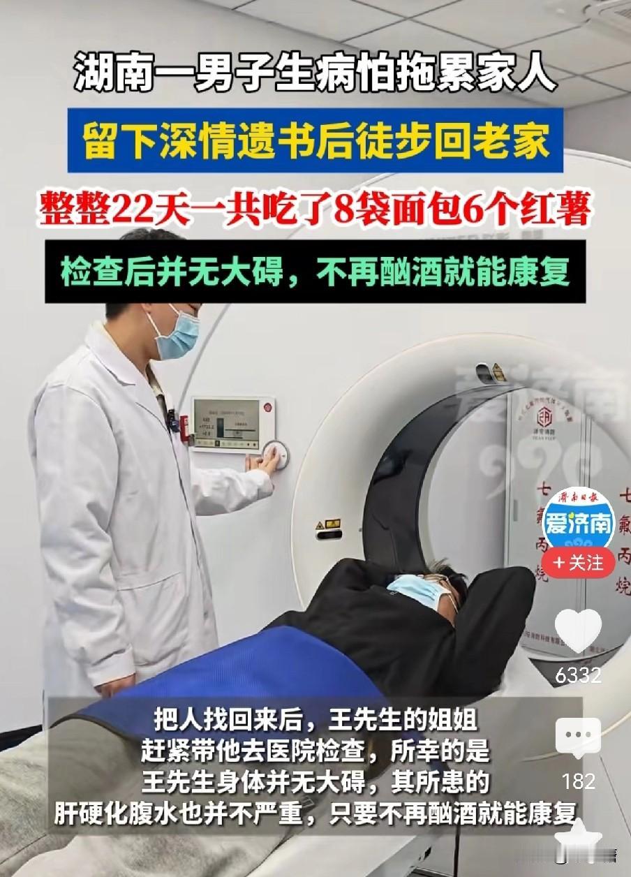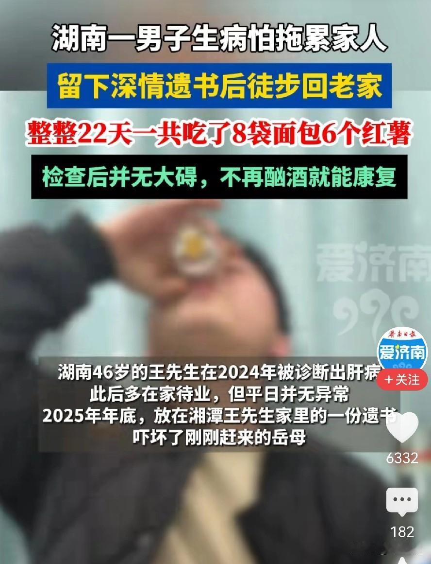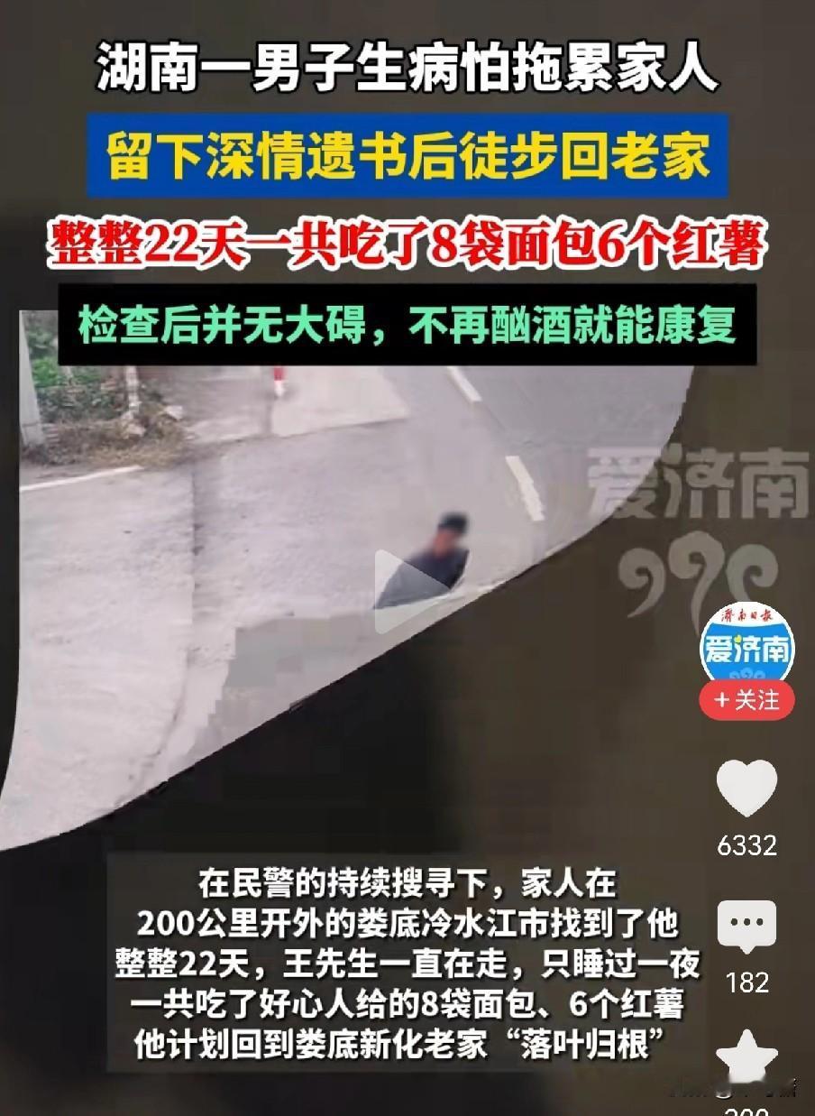 46岁的湖南大哥李某(化名),这大半年真是把罪受遍了。2024年查出肝病那天起,他就没法再上班挣钱了,只能在家歇着养身体,心里本来就挺不是滋味。原以为好好调理能慢慢好转,可没想到熬到2025年底,身上越来越不得劲,去医院一查,居然患上了肝腹水。 这诊断结果一出来,大哥直接蔫了。本来在家待业这么久,没一分收入,家里的开销全靠老婆撑着,他早就觉得自己是个累赘。再加上这两年大环境不好,找工作难上加难,他越想越钻牛角尖,觉得自己就是个拖油瓶,把整个家都拖垮了。日子过得没滋没味,活着也没啥盼头,不如早点了断,别再拖累老婆孩子。 某天早上,大哥悄悄写了封遗书,字里行间全是对家人的愧疚,说自己不想再添麻烦,打算回老家用自己的方式“落叶归根”。写完把遗书往桌上一放,揣了点零钱,就悄悄离开了家,没跟任何人打招呼。 好在他岳母当天正好来探望,一进门没看见人,桌上的遗书看得老太太魂都快没了。她知道女婿这是想不开要走绝路,哪敢耽误啊,手抖着就打了110报警。民警接到电话,一刻也不敢耽搁,赶紧调了大哥家附近的监控,一点点排查他的行踪。 谁也没想到,大哥这一走,居然是靠两条腿徒步往前走,一走走了整整22天!这22天里,他就踏踏实实睡过一个晚上,其余时间不是在赶路,就是在路边凑活眯一会儿。一路上没带多少吃的,全靠好心人接济。有人看他可怜,送了8个面包;还有老乡心疼他,塞了6个热乎乎的红薯,这些就是他22天里的全部口粮。要知道,大哥以前总爱喝两口酒解愁,可这一路,他半滴酒都没沾,心里大概是真的没了念想。 民警顺着监控一路追查,终于在200公里外的隔壁城市找到了他。那时候的大哥,穿着一身沾满灰尘的衣服,脸色蜡黄,眼神空洞,整个人瘦得脱了形,看着就让人心疼。赶来的家人一见他,当场就哭了,拉着他的手劝个不停,把他接回了家。 回到家后,家人立马带他去医院做了详细检查。没想到医生看了结果后说,他的肝腹水其实并不严重,只要以后不再喝酒,好好调理身体,多锻炼锻炼,完全有希望恢复健康。这话一说,全家悬着的心总算落了地,大哥脸上也终于有了点血色。原来自己一直瞎琢磨,把病情想严重了,还差点做出让自己后悔、让家人伤心的事。 现在大哥也想通了,只要好好治病,好好活着,就是对家人最好的报答。那些一路上帮助过他的好心人,还有拼尽全力找他的民警,都让他觉得这世上还有温暖,活着比啥都强。