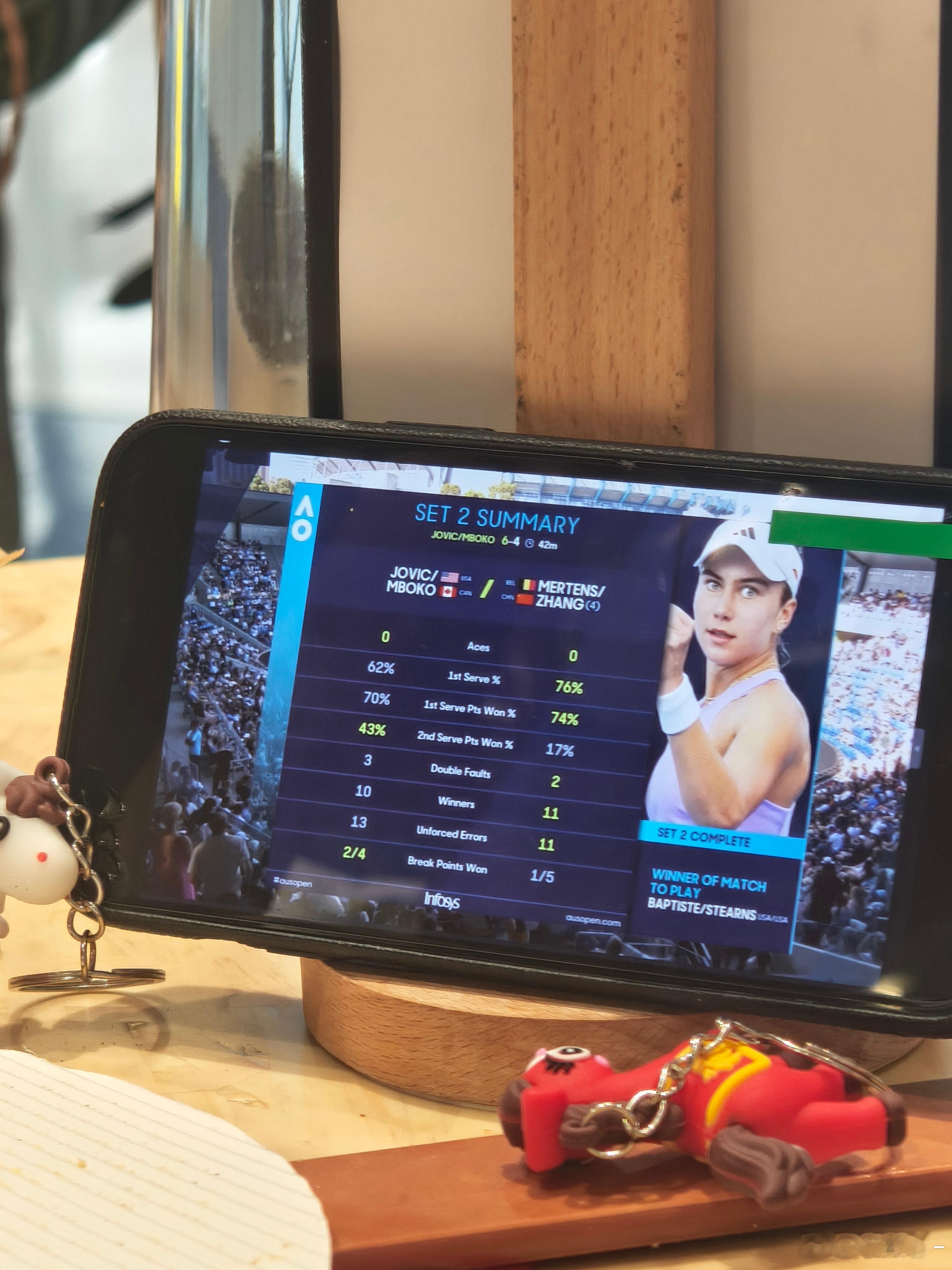张帅&梅尔滕斯 1-1 约维奇&姆博科即将决胜盘…第二盘输了就输了,盘末阶段,失误有点多而且快。第一次get到梅尔滕斯的控球!球商真的可以的!一直搭下去叭~澳网2026这很澳网wta