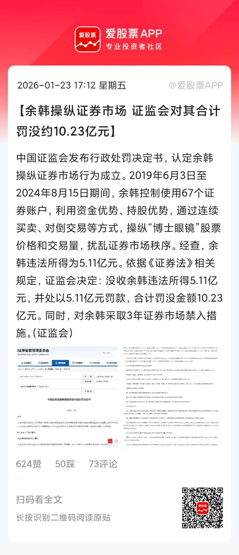 2026村里的1号罚单,自然人余韩因为操纵博士眼镜,被证监会一把罚了10亿!刀锋没记错的话,这个金额是徐翔后最高的了。 这货5年就做了一个股票(2019年6月至2024年8月),这只股票叫博士眼镜。通过集中资金优势、持股优势连续买卖,以及账户对倒等手段,股价从5块钱一路干到20块钱!吸引散户追高接盘,最终“割韭菜”离场。 好家伙,10个亿!这罚单看着都肝颤。这姓余的哥们儿,也算是“匠心独运”了,五年时间,啥也不干,就盯着一只股票往死里“做”。博士眼镜,愣是从五块被他“运作”到二十块,翻了两番。他玩的那些把戏,什么集中资金拉抬、自己账户之间左手倒右手制造虚假交易,都是操纵市场的老套路,一点新意都没有,但胆子是真肥。 他为啥能成?说白了,就是利用资金优势,当了个“庄家”。先在低价位偷偷吸够筹码,然后开始表演,对倒拉高,画出一根漂亮的上升K线图,吸引那些看图说话、想跟着喝汤的散户冲进来。等散户们跟风追高,把股价托到高位,他就在山顶上悄悄把手里的货全倒出去,套现走人。留下的,就是一地鸡毛和在高位接盘、欲哭无泪的普通股民。这过程,跟设局骗钱没啥本质区别。 现在罚他十个亿,罚得好!罚得解气!这种人不重罚,市场就没法干净。想想那些被坑的散户,可能是一辈子的积蓄,指望着在股市里增值养老,结果被他这么一搞,血本无归。十个亿的罚款,是对他非法获利的追缴,更是杀鸡儆猴,给所有想铤而走险、操纵市场的人看看,现在的监管是动真格的,伸手必被捉,而且代价你承受不起。 这也给咱们所有炒股的人提了个醒。天上不会掉馅饼,那些短期内脱离基本面、蹭蹭往上涨的股票,背后说不定就藏着这种黑手。别光看K线图漂亮就头脑发热往里冲,得多想想公司的业绩到底咋样,支撑得起这个价格吗?远离这种明显被操纵的股,不贪心,不跟风,才是保护自己钱包最实在的办法。指望跟庄家斗,你手里那点钱,根本不够看。 各位读者你们怎么看?欢迎在评论区讨论。嘉兴博士眼镜 尚博士眼镜 星博士眼镜 博士星眼镜 余医生眼镜 清溪博士眼镜 眼镜研究员