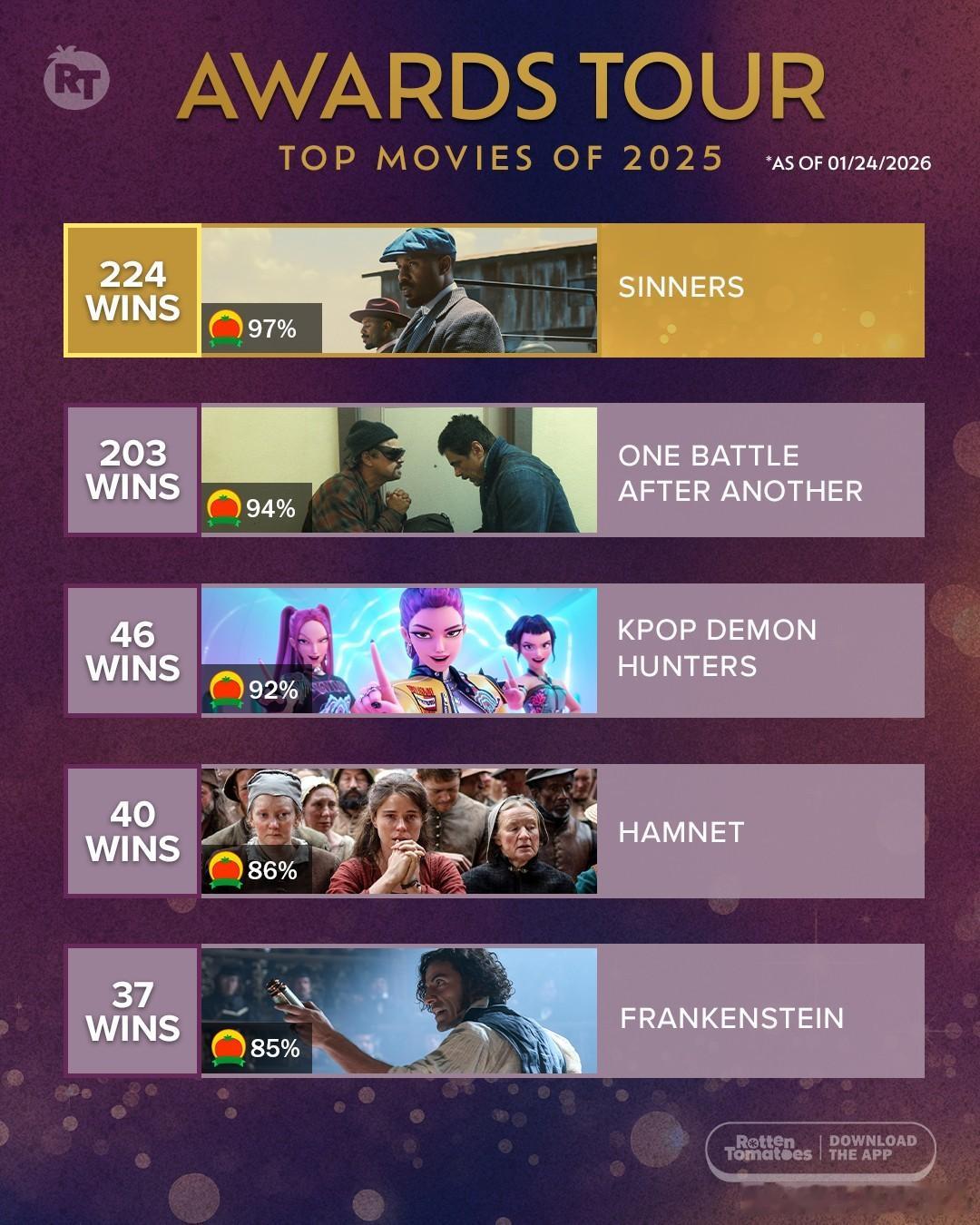 今年颁奖季获奖次数最多的电影:1. 《罪人》 224项2. 《一战再战》 203项3. 《K-POP:猎魔女团》 46项4. 《哈姆奈特》 40项5. 《弗兰肯斯坦》 37项