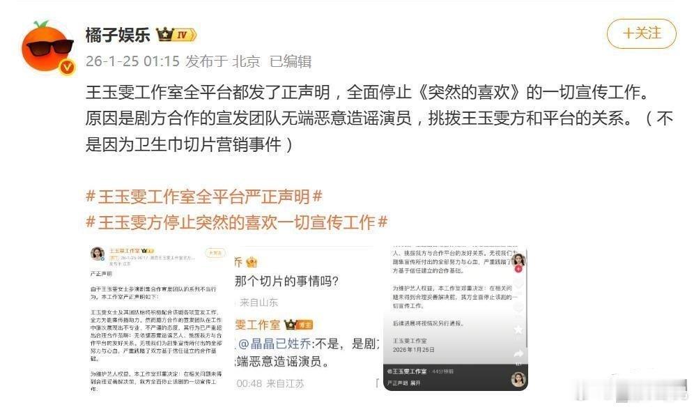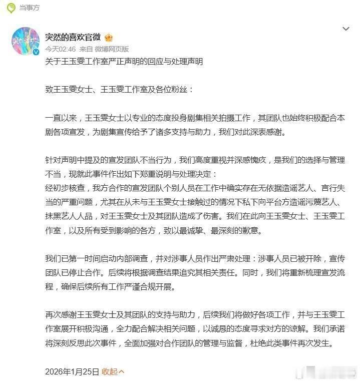 1月25日凌晨,娱乐圈上演了一出“手撕”戏码。王玉雯工作室一纸严正声明,宣布“全面停止《突然的喜欢》一切宣传工作”,直接将剧集宣发团队送上了舆论的火刑架。紧随其后,《突然的喜欢》官微凌晨滑跪致歉,承认“造谣”,并火速开除了涉事人员。这场由幕后蔓延至台前的风波,瞬间炸翻了吃瓜群众的首页。据工作室声明,剧集宣发团队在根本未与艺人方沟通的情况下,竟向合作平台散布了一系列虚假信息。最典型的例子是:王玉雯明明是按剧方要求,在单日发布了两条抖音宣传内容,宣发团队却转头向平台“告黑状”,谎称这些物料是“艺人自行策划”。这一招直接导致微博平台误判王玉雯违反了剧宣期“单日发帖不超过3条”的潜规则,并向艺人团队发起问责。这波操作的精髓在于“精准甩锅”。面对剧宣期可能存在的平台规则冲突,宣发团队非但不协调解决,反而将责任全部推诿给艺人,蓄意破坏王玉雯与播出平台之间的协作基础。工作室的声明措辞严厉,直指此举属于“无依据恶意挑拨与合作平台的友好关系”,彻底踩中了艺人团队的底线。更令人心寒的是背景。王玉雯团队此前积极配合了包括直播、扫楼在内的大量剧集宣传工作,贡献有目共睹。然而,宣发团队不仅无视这些付出,甚至进一步抹黑艺人人品,导致双方的合作信任彻底归零。忍无可忍,工作室最终选择以“全面停止宣传”作为维权武器,并强调此举是针对问题,而非抵制剧集本身,要求剧方在解决问题前暂停一切合作。在声明评论区,工作室人员也多次澄清,此次停宣与剧中此前引发的“卫生巾切片营销争议”无关,矛头仅指向宣发团队的职业操守。剧方《突然的喜欢》的回应堪称光速。在工作室声明发出后不久,其官微便在凌晨发布致歉,承认宣发团队确实存在造谣行为,已立即开除涉事人员、终止合作,并承诺整改流程。