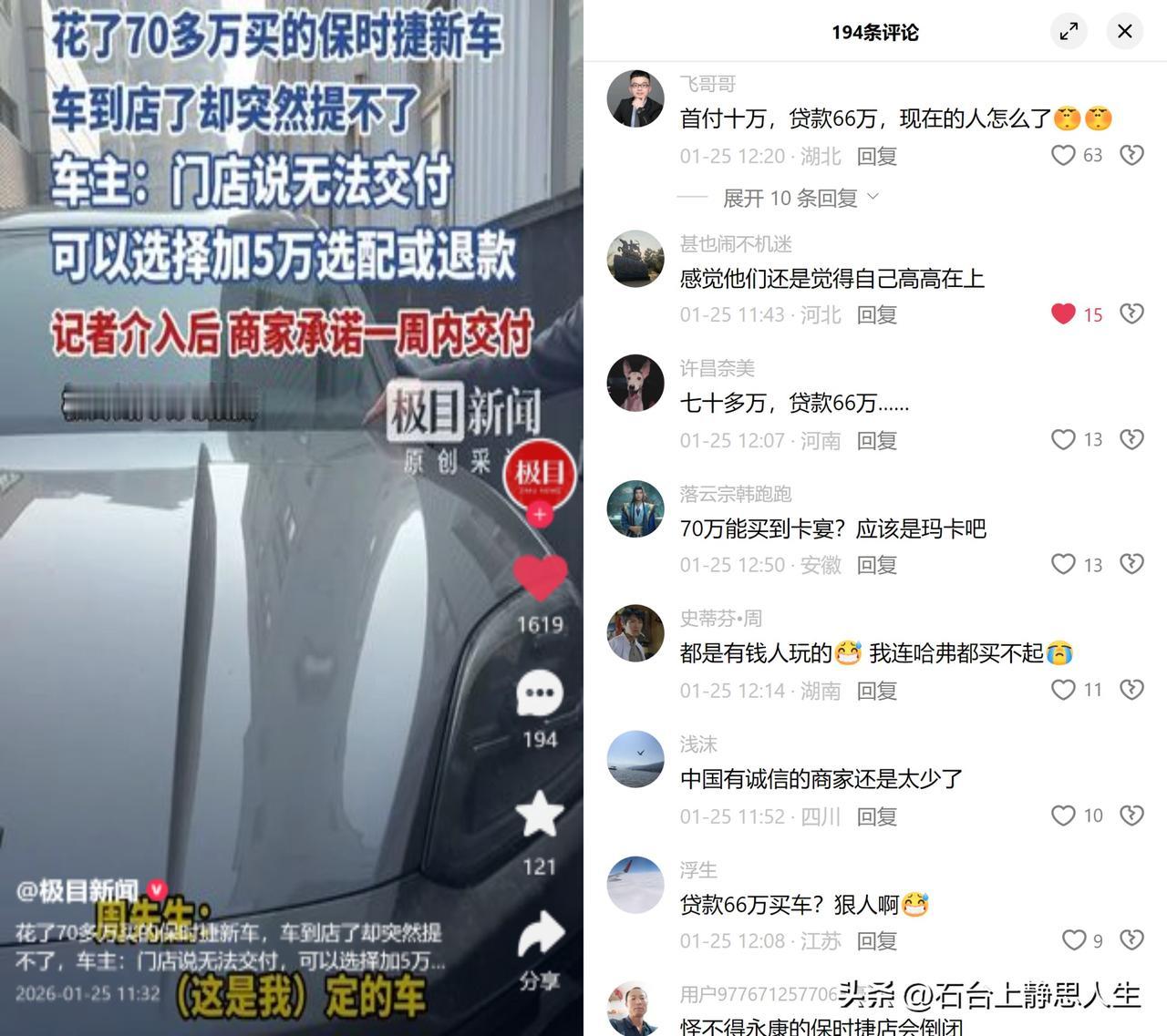 武汉一车主70万订的卡宴到店,突然被要求加5万选配才能提车。 周先生去年11月订的车,车架号都定了,钱也付了70多万,结果车到了4S店说要么加钱要么退款,记者介入后才承诺一周内交车。 这事儿看着是商家耍无赖,归根结底是最近卡宴降价闹的,2025年开始,卡宴入门款裸车全国都能讲到70-75万,比指导价低了快30%,经销商卖一辆亏一辆,只能在提车环节找补:要么加5万选配,要么退款。换谁不糟心?车架号都定了,钱也付了,突然被卡脖子。 有人说70万买不到卡宴?2025年还真能,但得做好提车被加钱的准备,你以为捡了便宜,人家早把利润塞到选配里了。还有人提到永康保时捷倒闭,这并非没有原因,降价猛了经销商顶不住,只能靠这种套路保利润,可消费者也不傻啊。 现在买豪车哪儿是买面子,分明是跟商家玩猫捉老鼠,你订车时算得精,人家提车时挖个坑。说到底,还是降价潮里的潜规则:经销商要活,消费者要公平,最后闹成这样,谁都不体面。