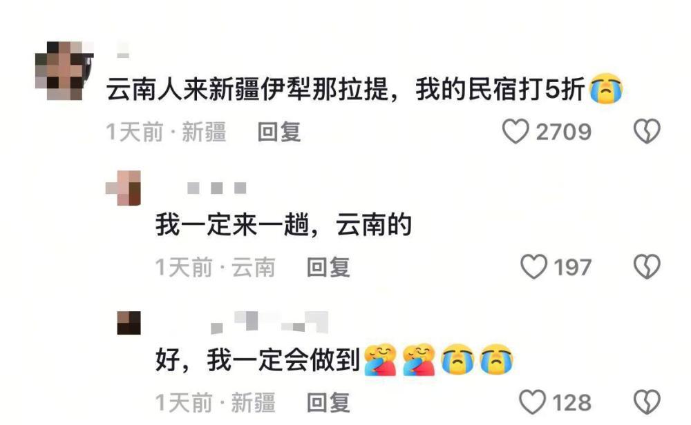 消息发布后,相关视频评论区涌入了大量网友留言。云南与新疆两地网友真诚互动,纷纷留言:“新疆的同志们,云南说到做到了”“欢迎云南伙伴来新疆”……其中,一位民宿老板的评论获得高赞:“云南人来新疆伊犁那拉提,我的民宿打5折。”