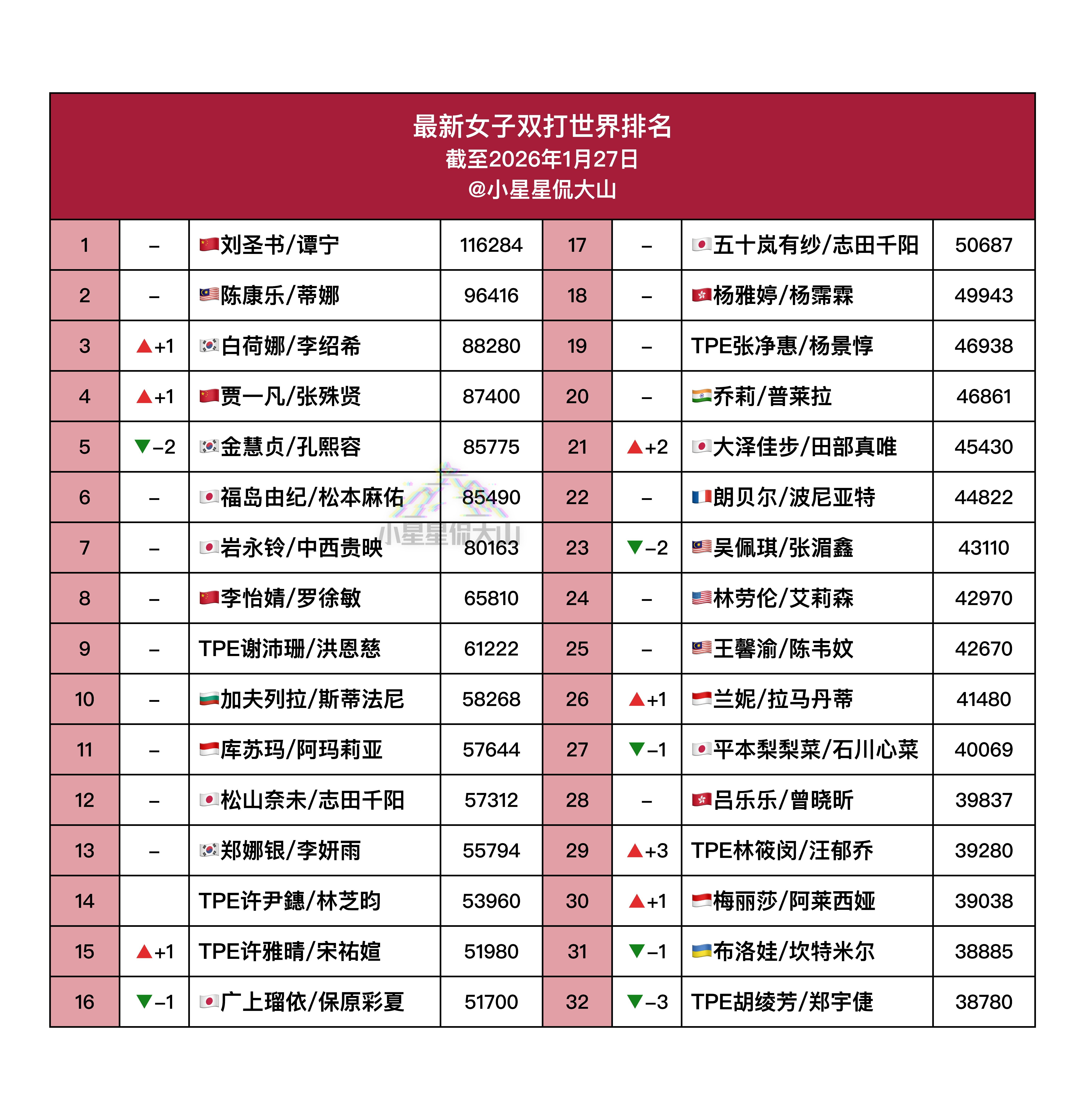 【最新女双世界排名】🇨🇳刘圣书/谭宁 1🏆陈康乐/蒂娜 2🇨🇳贾一凡/张殊贤 5➡️4🇨🇳李怡婧/罗徐敏 8 2026年印尼羽毛球大师赛