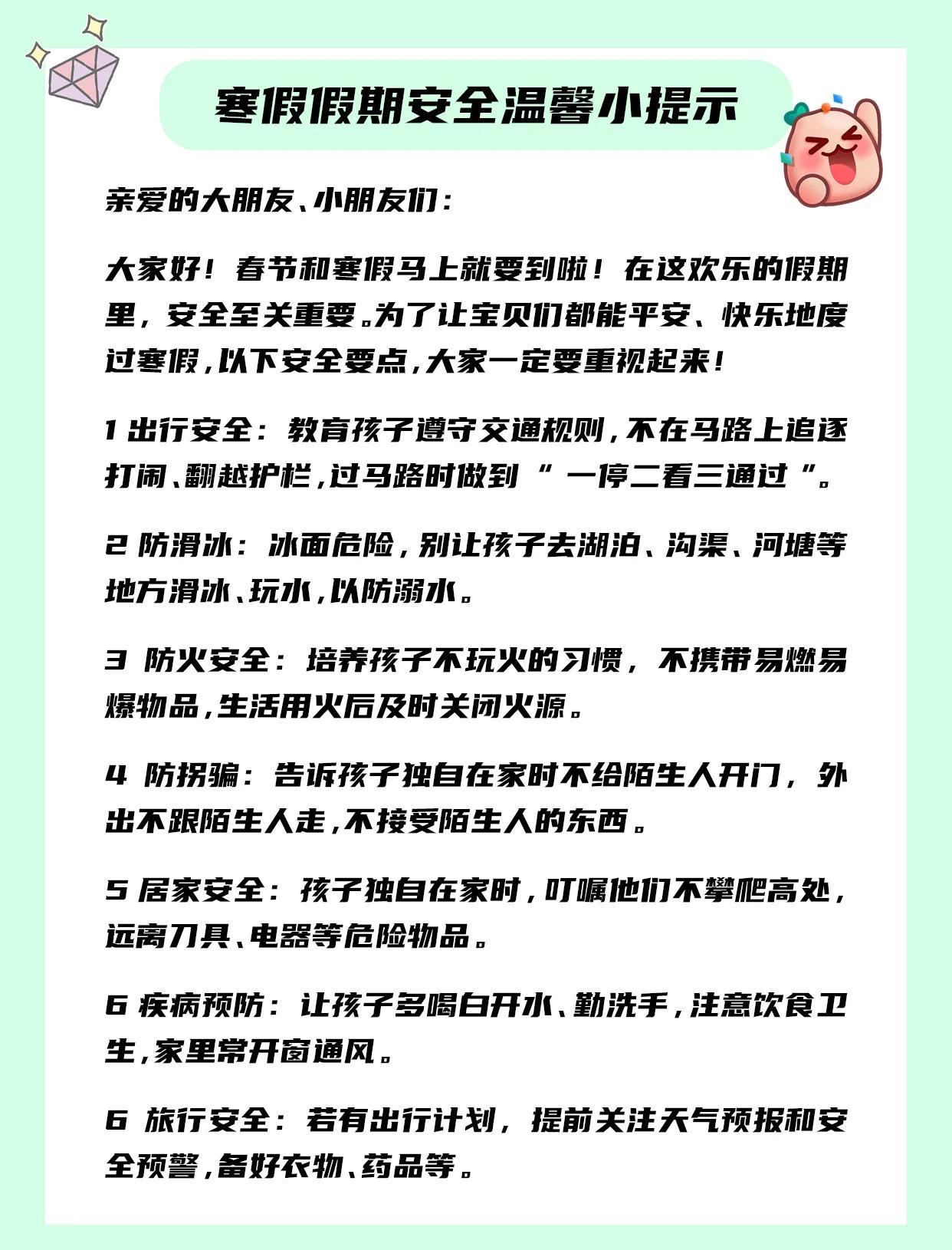 寒假来临这份安全指南请签收!90%家长忽略的隐患,看完连夜排查 “终于放假啦!”当孩子蹦着跳出校门,家长们的心情却一半是欢喜一半是愁。双减后校外培训降温,本应是孩子自由撒欢的假期,却成了无数家庭的“安全大考”——双职工上班孩子无人管,老人带娃力不从心,各类意外事故趁虚而入教育部数据扎心了:寒假中小学生意外伤害发生率比平时高出37%,62%的事故都发生在看似安全的家里!这份关乎孩子平安的指南,每位家长都该连夜看完。 别觉得安全事故离自己很远,那些触目惊心的案例都在敲响警钟。西昌两名9岁男孩私自燃放烟花引发山火,家长最终赔偿30万元;另一起类似事件更造成115万元损失,原本的童年乐趣变成家庭重担。而居家安全隐患更隐蔽:忘关的燃气、乱拉的电线、阳台未封的护栏,甚至随手放在桌上的干燥剂,都可能成为“隐形杀手”。杭州某社区曾发生老人接送孩子时刷手机,导致孩子走失半小时的险情,老人管娃的“力不从心”已成普遍痛点。 很多家长以为“看着孩子”就是安全,却忽略了假期里的“高危雷区”。未满12岁骑自行车、16岁以下骑电动车,这些看似常见的行为其实都违反交通规则;野外冰面玩耍、私自约见网友、沉迷手机泄露家庭信息,每一个都可能酿成大错。更值得警惕的是新型风险,比如伪装成“提神减肥”产品的新型毒品,以及网络上的“隔空猥亵”,都在盯着缺乏防备的孩子。 其实守护孩子安全,关键在于“提前预判+科学引导”。家长要牢记“四必查”:查家中燃气电器是否安全,查阳台窗户是否做好防护,查孩子是否知晓应急电话,查电子产品是否设置安全模式。出门前务必做到“三告知”:告知去向、告知同伴、告知返回时间,不让孩子脱离视线范围。面对烟花爆竹、网络使用等“敏感问题”,与其暴力禁止不如耐心说教,比如陪同孩子在空旷场地燃放烟花,约定每天手机使用不超过1小时。 寒假的意义,是让孩子在休息中成长,而非在风险中“闯关”。那些看似繁琐的安全提醒,那些被反复强调的注意事项本质上都是对孩子最深沉的守护。愿每位家长都能把安全放在心上,让孩子既能享受假期的自由快乐,也能平安健康地迎接新学期。此刻就转发给家人朋友一起筑牢安全防线——孩子的平安,才是这个假期最珍贵的礼物!