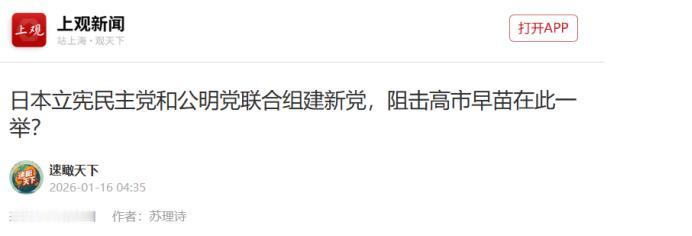 172:233!高市重新洗牌,日本新首相人选出炉,对中国态度不简单 先说说这场混乱的导火索,就是现任首相高市早苗干的一件狠事,在1月23日通常国会刚开幕的当天,直接签署了解散众议院的决议书,摆明了要提前搞大选。 这操作看着突然,其实全是她的无奈之举,说白了就是一场孤注一掷的政治豪赌。要知道,高市早苗去年10月才好不容易当选首相,成为日本历史上第一位女首相,这位置还没坐热乎,就已经焦头烂额了。 就在高市早苗抛出这颗“炸弹”的同时,日本在野党那边也没闲着,直接抱团反击,凑出了第二场政治地震。 最大的在野党立宪民主党,居然和自民党多年的老盟友公明党联手,在1月16日召开记者会,宣布组建新党“中道改革联合”,还公布了共同纲领,摆明了要在大选中联手对抗高市早苗领导的执政阵营。 这波操作堪称“反水名场面”,毕竟公明党之前和自民党合作多年,在小选区有着一万到两万张选票的动员能力,以前这些票都用来支持自民党,现在转头就帮着在野党,对选举格局的影响可想而知。 这就引出了172:233这个关键的席位对比,目前日本众议院共有465个议席,高市早苗领导的执政联盟(自民党+日本维新会)大概握有233个席位,而新组建的“中道改革联合”,由立宪民主党的148名众议员和公明党的24名众议员组成,刚好是172个席位。 从数字上看,执政联盟暂时占优,但这可不是绝对的优势,毕竟大选还没开始,公明党的选票动员能力一旦完全偏向新党,很可能会撬动不少小选区的结果,到时候谁输谁赢还真不好说。 而且这新党的算盘打得很精,并没有彻底解散立宪民主党和公明党,只是让参加众议院选举的候选人退党加入新党,参议员和地方议员还留在原党,这样既能集中力量对抗执政联盟,又能保住各自的基本盘。 他们主打“中道”路线,喊着政治改革和务实外交的口号,说白了就是抓住高市早苗激进右翼路线不得人心的痛点,争取中间派选民的支持,本质上还是一场为了争夺政权的利益博弈。 不管这场大选最终结果如何,有一点可以肯定,日本政坛的这波洗牌,背后藏着对中国态度的复杂考量,尤其是高市早苗的立场,必须得警惕。 作为安倍晋三的忠实追随者,高市早苗的右翼底色早就根深蒂固,2021年就和安倍一起参拜靖国神社,上台后更是屡次在台湾问题上踩红线,公然发表挑衅言论,引发咱们强烈反对。 她还一门心思要修订日本的安保三文件,大幅增加防卫费,提升所谓“持久作战能力”,明眼人都能看出来,这背后很大程度上就是针对中国。 但她的强硬态度也不是毫无顾忌,日本经济对中国的依赖度摆在那,要是真把中日关系搞僵,受损的还是日本自己。 之前她发表涉台言论后,日本旅游业和部分出口行业就已经感受到压力,这也是她国内支持率下滑的原因之一。所以她的对华政策,其实透着一种矛盾,既要靠着反华言论讨好国内右翼势力、抱紧美国大腿,又不敢彻底和中国撕破脸,怕影响国内经济。 而新组建的“中道改革联合”,虽然喊着务实外交的口号,看似比高市早苗的激进路线温和,但也未必会对中国友好。公明党之前和自民党合作时,在对华问题上也没少跟着附和,立宪民主党虽然偶尔提一提要改善中日关系,但在核心利益问题上,也不敢轻易突破日本政坛的主流对华认知。 说白了,不管是高市早苗的执政联盟,还是新组建的在野党联盟,其对华政策的根本出发点都是维护日本的所谓“国家利益”,都不会放弃和美国的同盟关系,也都会在台湾、钓鱼岛等问题上做文章。 现在日本政坛的这场大戏才刚刚拉开帷幕,高市早苗的政治豪赌能不能成功,新党能不能逆袭,都要等大选结果出来才知道。但对咱们来说,不管日本谁上台,都得保持清醒,不能抱有幻想。 高市早苗如果连任,大概率会继续走激进对华路线,不断在周边制造摩擦;就算新党上台,中日关系也未必能迎来实质性改善,顶多是从“强硬对抗”转向“温和制衡”。 说到底,日本政坛的洗牌改变的只是权力格局,不变的是其谋求地区影响力、依附美国制衡中国的本质。 咱们能做的,就是做好自己的事,不断提升自身实力,不管日本那边怎么折腾,都能稳稳守住自己的核心利益,任他风云变幻,自有底气在身。这场政治博弈最终会走向何方,咱们就接着看,但对日本任何形式的挑衅,都必须坚决反击,绝不姑息。