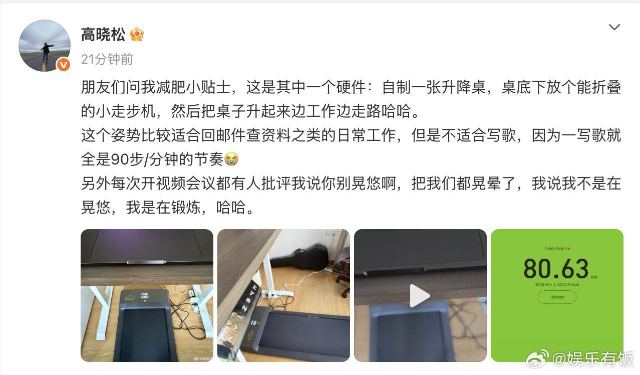 高晓松为减肥自制升降桌跑步机高晓松分享减肥技巧 高晓松分享自己的减肥小妙招:自制升降桌 + 桌下折叠小走步机,边回邮件查资料边走路锻炼,还调侃 “写歌时节奏全是 90 步 / 分钟”,连开视频会议都被吐槽 “别晃悠”,他解释 “我是在锻炼”~