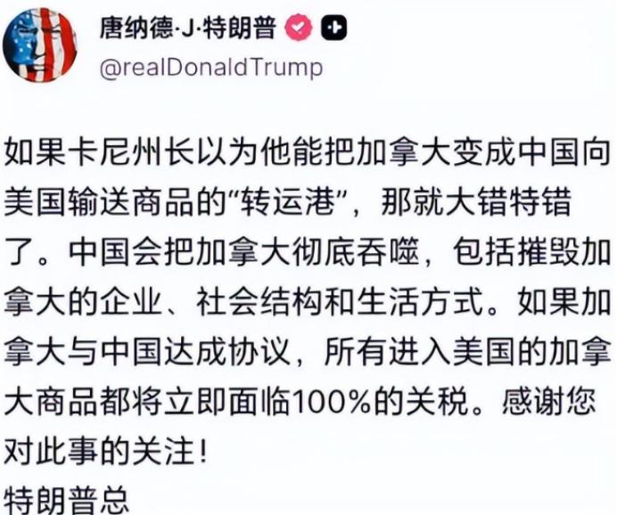 演都不演了,特朗普叫嚣和中国签协议就翻倍征税,首个受害者出现 要想说清楚这事儿的来龙去脉,还得从卡尼那趟盼了八年的访华行程说起。今年1月中旬,卡尼带着代表团来中国,这是加拿大总理时隔八年再访华,本来就是奔着修复关系、谈经贸合作来的,结果没想到真谈成了不少干货。 双方不仅签了个《中加经贸合作路线图》,这可是两国经贸史上第一份高水平合作文件,还敲定了28条具体合作举措,从农业、能源这些老领域,到新材料、清洁能源这些新赛道,都规划得明明白白。 更实在的是,双方还针对性解决了不少老矛盾,比如加拿大之前对中国电动汽车加征100%的附加税,这次就改成了每年4.9万辆的配额,配额内只收6.1%的最惠国关税,配额还会逐年增加。 相应地,中方也会调整对加拿大油菜籽的反倾销措施,让两国农产品贸易能顺畅点。当时不管是中加双方,还是加拿大国内的行业协会,都挺高兴,觉得这趟访华没白来,总算能给疲软的加拿大经济找条新出路。 就在卡尼访华归来没几天,当地时间1月24日,特朗普直接在社交媒体上撂下狠话,虽然没明说“中国”俩字,但意思再清楚不过——要是加拿大敢跟某个国家达成贸易协议,就对进入美国的加拿大商品征收100%的关税。这哪是威胁,简直是赤裸裸的绑架。 要知道,去年美国对加拿大的关税就已经够狠了,钢铝产品最高加到50%,能源产品加10%,已经把加拿大的出口行业折腾得够呛。2025年第二季度,加拿大GDP按年率下滑1.6%,出口直接跌了7.5%,汽车、木材这些支柱产业全被美国的关税搞得元气大伤。现在特朗普一开口就是100%,比去年翻了一倍还多,这是摆明了要把加拿大的经济往死里逼。 作为第一个受害者,卡尼的处境瞬间就僵住了。一边是刚谈成的中加合作,眼看着能给国内经济注入活力,尤其是加拿大的电动汽车行业,协会总裁都直言不讳,说特朗普已经不是可靠的合作伙伴,卡尼调整对华政策“正当其时”,毕竟总不能一棵树上吊死。 但另一边,美国是加拿大最大的贸易伙伴,两国经济深度绑定,真要是被征100%关税,加拿大的出口业基本上就垮了。被逼到墙角的卡尼,只能用一种不算强硬的方式表态。 当天就发了段视频号召加拿大人“购买国货”,说“我们无法控制其他国家的行为,但可以成为自己最好的客户”。这话听着有点硬气,实则满是无奈——既不敢直接跟美国撕破脸,又不想放弃和中国的合作,只能用这种方式给自己找台阶下,也给国内一个交代。 其实加拿大官员和行业内的反应,比卡尼的表态更耐人寻味。除了电动汽车协会,不少行业都在私下抱怨美国的反复无常。 之前加拿大为了缓和和美关系,已经多次妥协,比如2025年6月底,为了恢复美加贸易谈判,加拿大直接取消了对美国科技公司的数字服务税,结果换来的还是美国变本加厉的威胁。 这一次,特朗普连装样子的耐心都没了,连“协商”的环节都跳过,直接亮明大棒,本质上就是霸权思维在作祟——美国要的不是平等的盟友关系,而是绝对的服从,只要加拿大敢偏离美国设定的轨道,哪怕只是和中国正常做生意,也要被惩罚。 说到底,特朗普这波操作根本不是为了什么“公平贸易”,而是怕中加经贸合作越来越深,削弱美国对加拿大的控制,甚至带动其他盟友跟风和中国深化合作,动摇美国的霸权根基。 他之前鼓励加拿大和中国谈,大概率是觉得加拿大翻不起大浪,还能借着加拿大试探中国的底线;等看到中加真的签了实质性协议,合作落地有声,就立刻翻脸,想用关税大棒把加拿大拉回来,同时也给其他盟友敲个警钟。 这种翻手为云覆手为雨的套路,美国玩了不少年,但这次连最基本的体面都不顾了,连盟友都直接拿捏,只能说明美国的霸权已经越来越没底气,只能靠这种蛮横的手段维持存在感。 而加拿大的困境,其实也是很多美国盟友的缩影——长期依赖美国的市场和安全保护,结果被美国当成了可以随意拿捏的棋子,一旦有自己的想法,就会被立刻制裁。 这次卡尼虽然被逼到了墙角,但并没有完全妥协,号召买国货也好,之前公开反驳特朗普也罢,都是在表达一种态度。更重要的是,中加达成的合作路线图是双方共同的意愿,不是美国一句话就能推翻的。 加拿大国内的行业已经看清了现实,知道不能再把鸡蛋都放在美国一个篮子里,寻找中国这样的新合作伙伴,已经成了必然趋势。 特朗普的100%关税威胁,看似来势汹汹,实则暴露了内心的焦虑。他以为靠高压就能逼加拿大就范,却忘了霸权不能解决一切问题,反而会倒逼盟友加速脱离控制。 卡尼这个首个受害者,或许会成为一个转折点,让更多美国盟友看清美国的真面目,主动寻求多元化的合作道路。毕竟在全球化的今天,靠胁迫和制裁维持的霸权,终究是走不远的,互利共赢才是人心所向。而特朗普这种“演都不演了”的蛮横,只会让美国在国际上越来越孤立,最后搬起石头砸自己的脚。