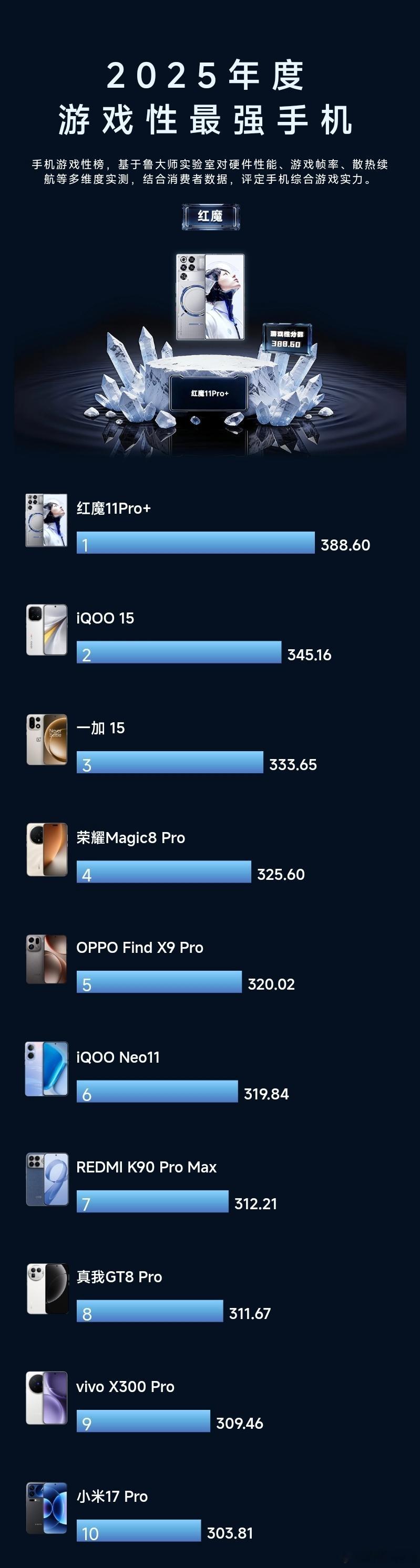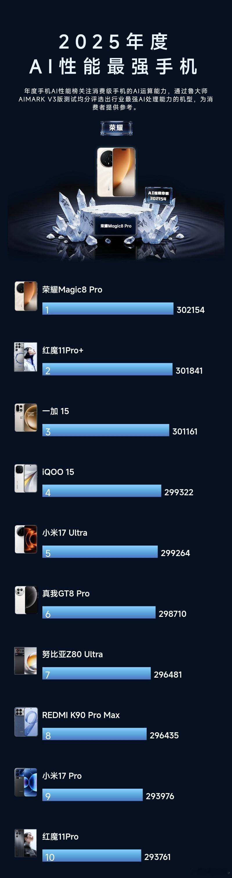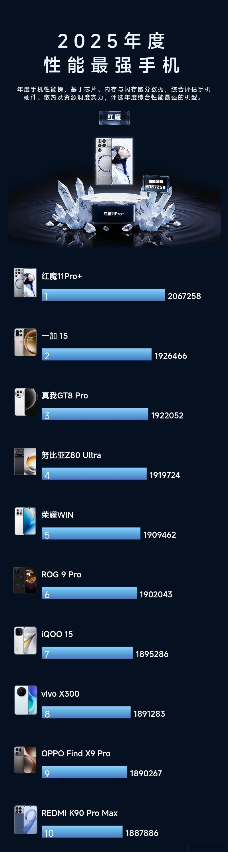 鲁大师2025牛角尖颁奖盛典「手机榜单」:性能最强手机芯片:骁龙8 Elite Gen 5AI性能最强手机:荣耀Magic8 Pro性能最强手机:红魔11 Pro+最流畅手机系统:ColorOS 16最流畅手机单机:iQOO 15游戏性最强手机:红魔11 Pro+最久用流畅手机:vivo X300 Pro鲁大师今年牛角尖颁奖盛典没啥热度啊,我才刚看到。小米玄戒O1性能力压骁龙8至尊版和天玑9400有点意思。怎么样,榜单符合你的预期么?