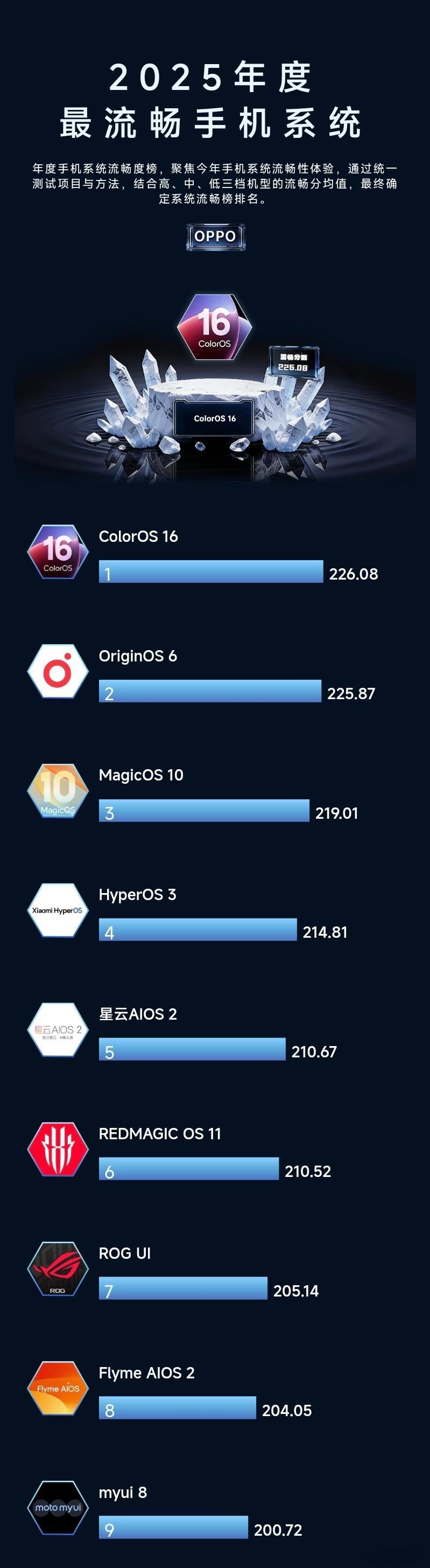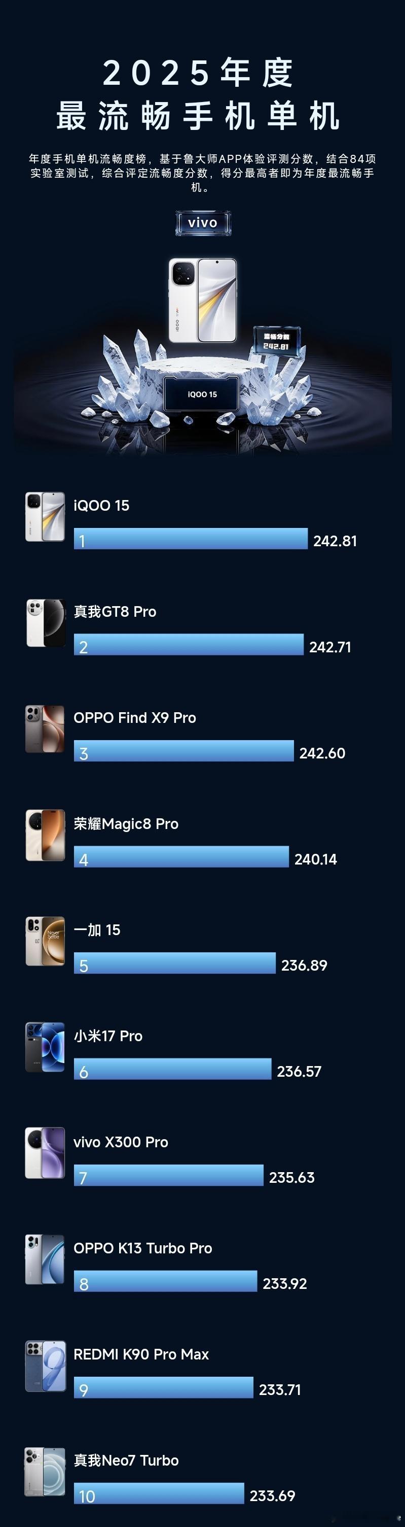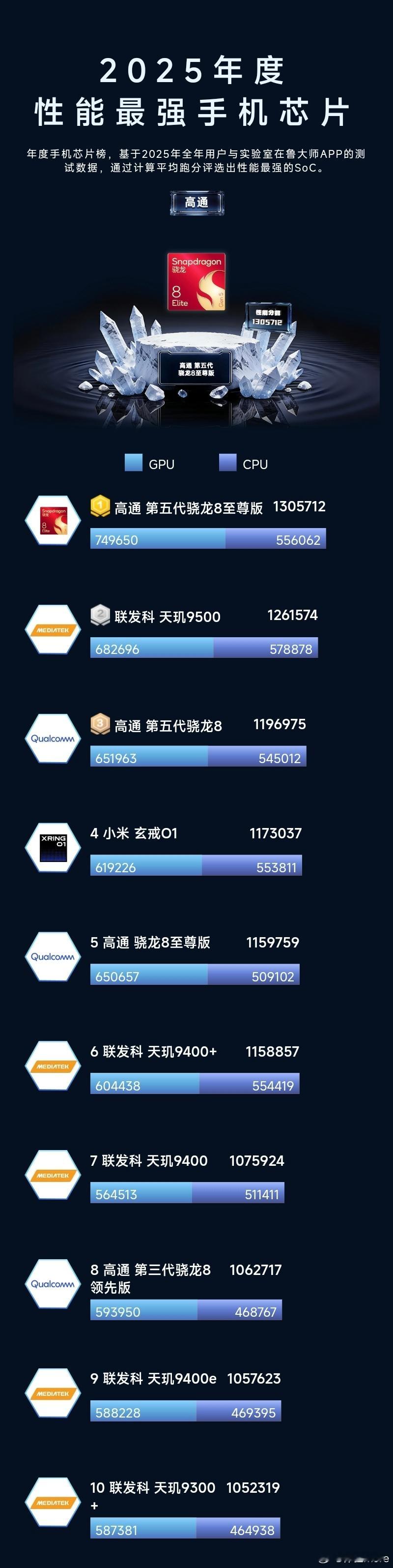 鲁大师2025牛角尖颁奖盛典「手机榜单」:性能最强手机芯片:骁龙8 Elite Gen 5AI性能最强手机:荣耀Magic8 Pro性能最强手机:红魔11 Pro+最流畅手机系统:ColorOS 16最流畅手机单机:iQOO 15游戏性最强手机:红魔11 Pro+最久用流畅手机:vivo X300 Pro鲁大师今年牛角尖颁奖盛典没啥热度啊,我才刚看到。小米玄戒O1性能力压骁龙8至尊版和天玑9400有点意思。怎么样,榜单符合你的预期么?