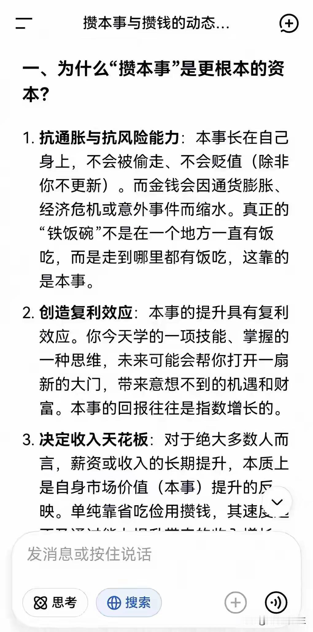 攒钱和攒本事哪个更重要 本事和存款哪个更能扛住人生暴击 攒钱和攒本事,哪个更重要?这是许多人在迷茫中反复问自己的问题。有人说,钱是万能的,没有钱寸步难行;有人则坚信,能力才是真正的底牌,能帮你在风雨中站稳脚跟。其实,这两者并非对立,而是相辅相成的两把钥匙,只有同时拥有,才能在人生的跌宕起伏中游刃有余。 试想一下,当你遇到突如其来的危机,比如失业、疾病、家庭变故,光有存款未必能帮你解决根本问题。钱可以缓解一时的压力,但如果没有应对危机的本事,下一次危机到来时,你依然可能束手无策。反过来,如果你只拼命攒技能、提升能力,却没有一点存款作为底气,一旦遇到紧急情况,可能会陷入两难——是继续“折腾”还是先解决燃眉之急?没有钱的能力,往往也难以发挥出应有的价值。 这让我想到一个现实中的“逆境者”。他们或许没有豪华的资产,但凭借坚韧的能力,逆境中依然能找到出路。这种“本事”就像是一块看不见的金矿,能在关键时刻帮你开辟出一条新路。而存款,则像是人生的“安全垫”,让你在风暴中不至于崩溃。两者结合,才是真正的“抗暴神器”。 更深层次地看,攒钱和攒本事,其实反映了我们对人生的态度:是否愿意为未来投资?是否愿意不断学习、提升自己?这不仅仅是财务管理或技能提升的问题,更是对自己责任感和未来的投资。有人说,钱可以帮你买到时间,但能力可以帮你赚到更多的钱和时间。 在这个快节奏、变幻莫测的时代,没有谁能一帆风顺。你会发现,真正能扛住人生暴击的,往往是那些既懂得理财,又不断学习、提升自己的人。他们懂得在“存钱”的同时,也在“存能力”。这才是我们每个人都应该追求的“终极武器”。 所以,攒钱和攒本事哪个更重要?其实答案是:两者都重要。没有谁能孤立存在,只有两者兼备,才能让你在风暴中站得更稳,走得更远。你准备好了吗?从今天开始,不只是攒钱,更要开始“攒本事”,让自己变得更有底气,迎接人生的每一次挑战!