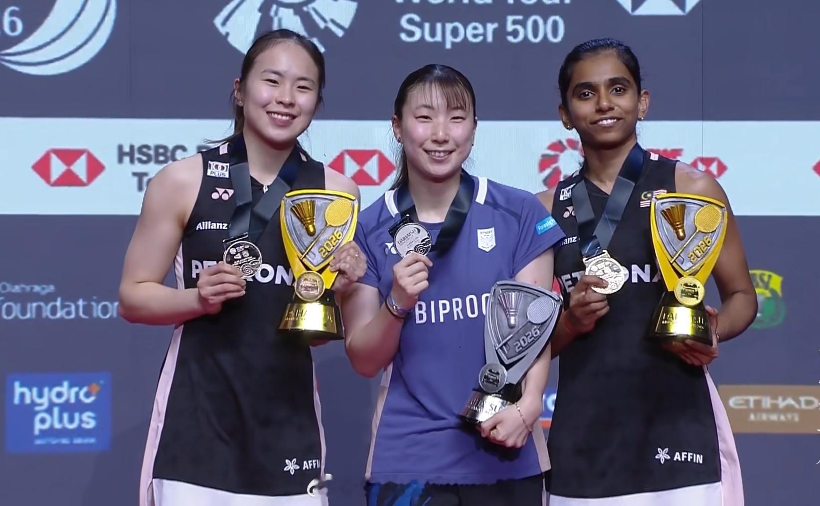 五十岚有纱和陈康乐/蒂娜在领奖台合影高桥美优🇯🇵或因伤病无法到场领奖(愿早日康复)2026年印尼羽毛球大师赛