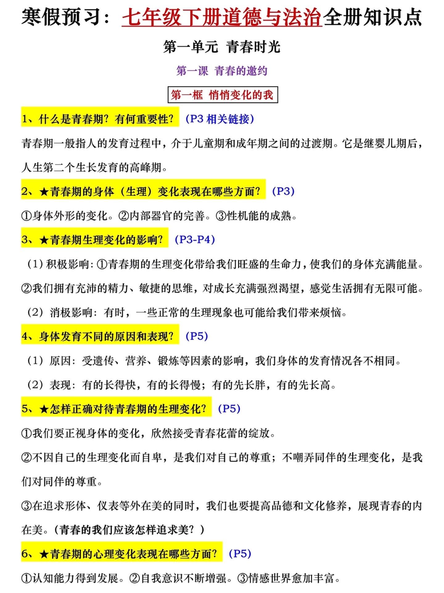 七年级下册寒假预习全篇重点必备知识点。
