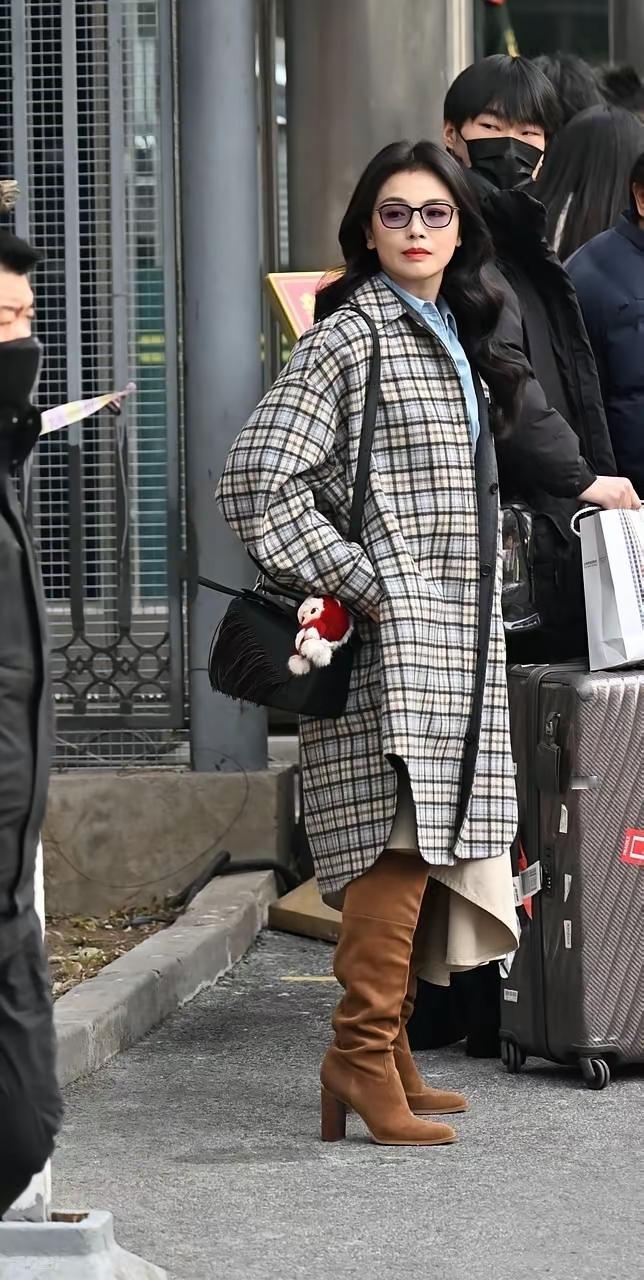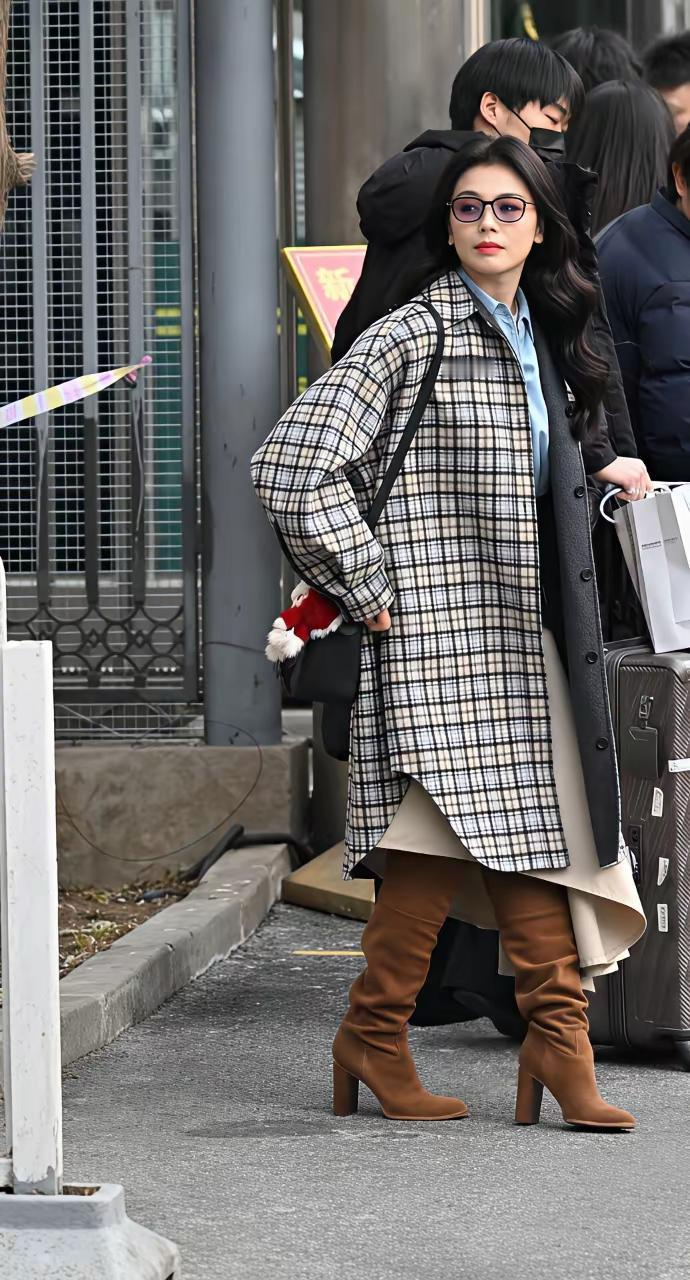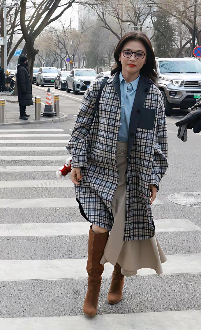 1月25日,刘涛北京街拍美爆了! 镜头下得刘涛,身穿格纹大衣,内搭天蓝色衬衣,看起来温柔有范,下搭驼色裙子,脚踩棕色高靴,这造型真是又美又飒! 她那乌海发亮的大波浪卷发造型,搭配黑色边框眼镜,彰显高大尚,看起来文艺范十足,这次街拍造型美爆了!