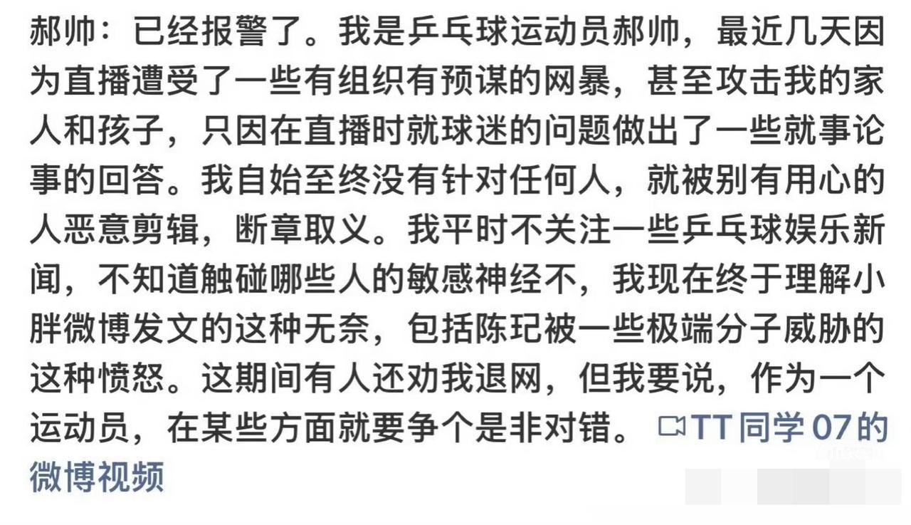 郝帅发文回应直播遭网暴——已经报警! 郝帅在直播时遭网络, 就因为说了最近运动员退役的事, 而有几个人还没有亲自宣布, 怪就怪郝帅嘴没有把门的, 退役的,现役的, 带官的,哪一个都提到了, 甚至是运动员分组, 国乒女队变化很大, 特别是莎莎这种级别的运动员 和教练都是双向选择! 至于网暴, 确实动了别人的面包, 粉丝们接受不了啦!